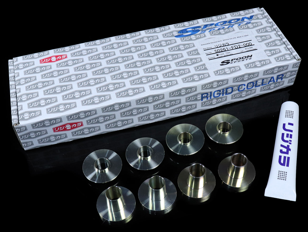 The Spoon Rigid Collar front 8-piece stability kit will improve crash safety, lower vibration reduction, prevent tire wear, indoor and outdoor noise reduction improved handling & stability by providing a more precise alignment of the front subframe-to-body.