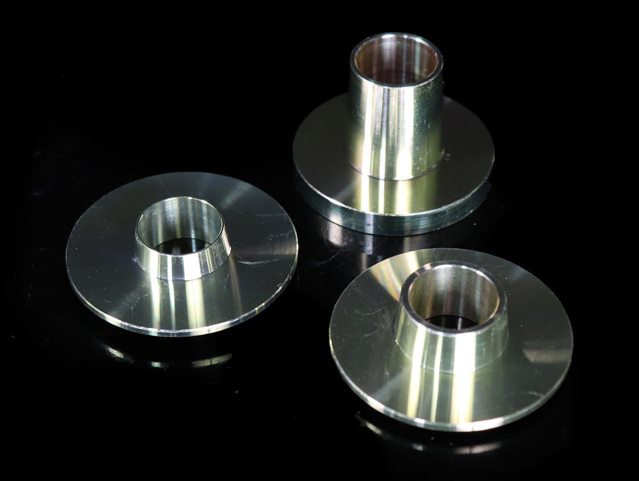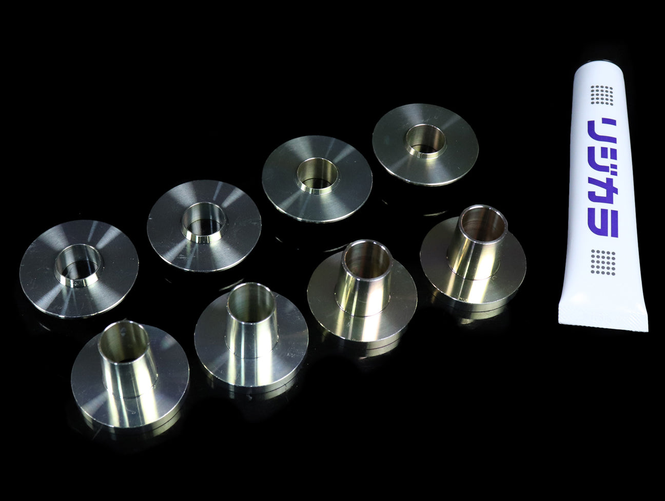 Collards are inserted into the subframe mounting holes to fill the 2mm gap around the bolts to provide a tighter fit. Prevents subframe from moving and rattling under load, thus reducing wobble of the steering wheel with uneven pavement. Sharpens suspension feel and increases chassis rigidity.