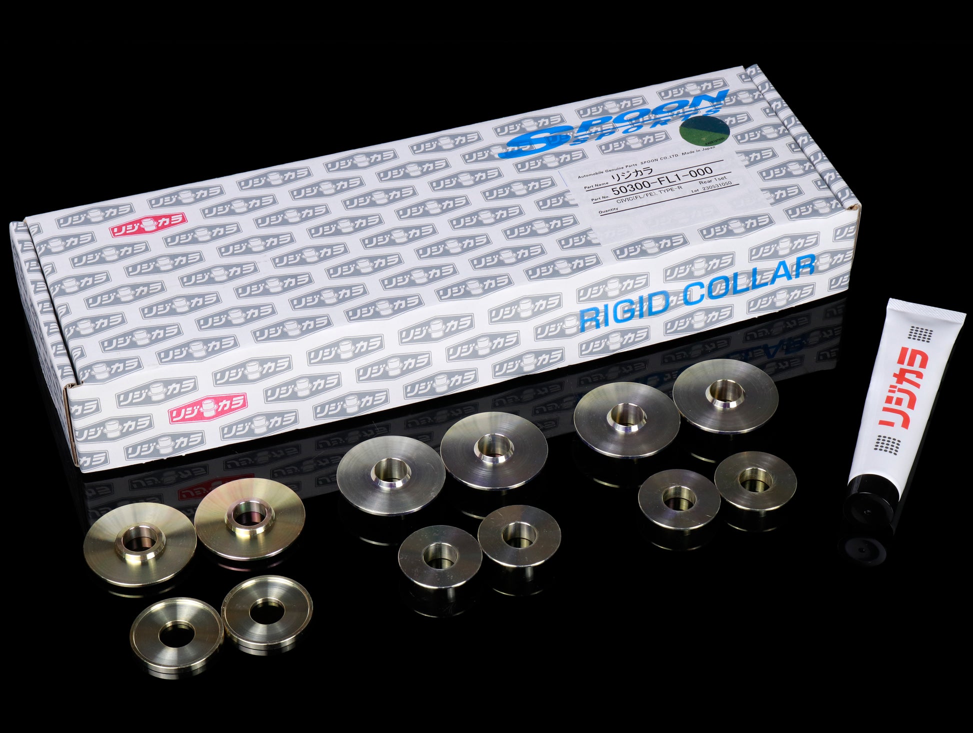 The Spoon Rigid Collar 12-piece stability kit will improve crash safety, lower vibration reduction, prevent tire wear, indoor and outdoor noise reduction improved handling & stability by providing a more precise alignment of the rear subframe-to-body.