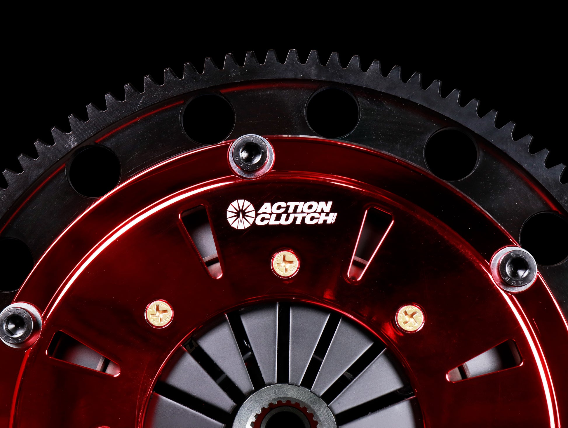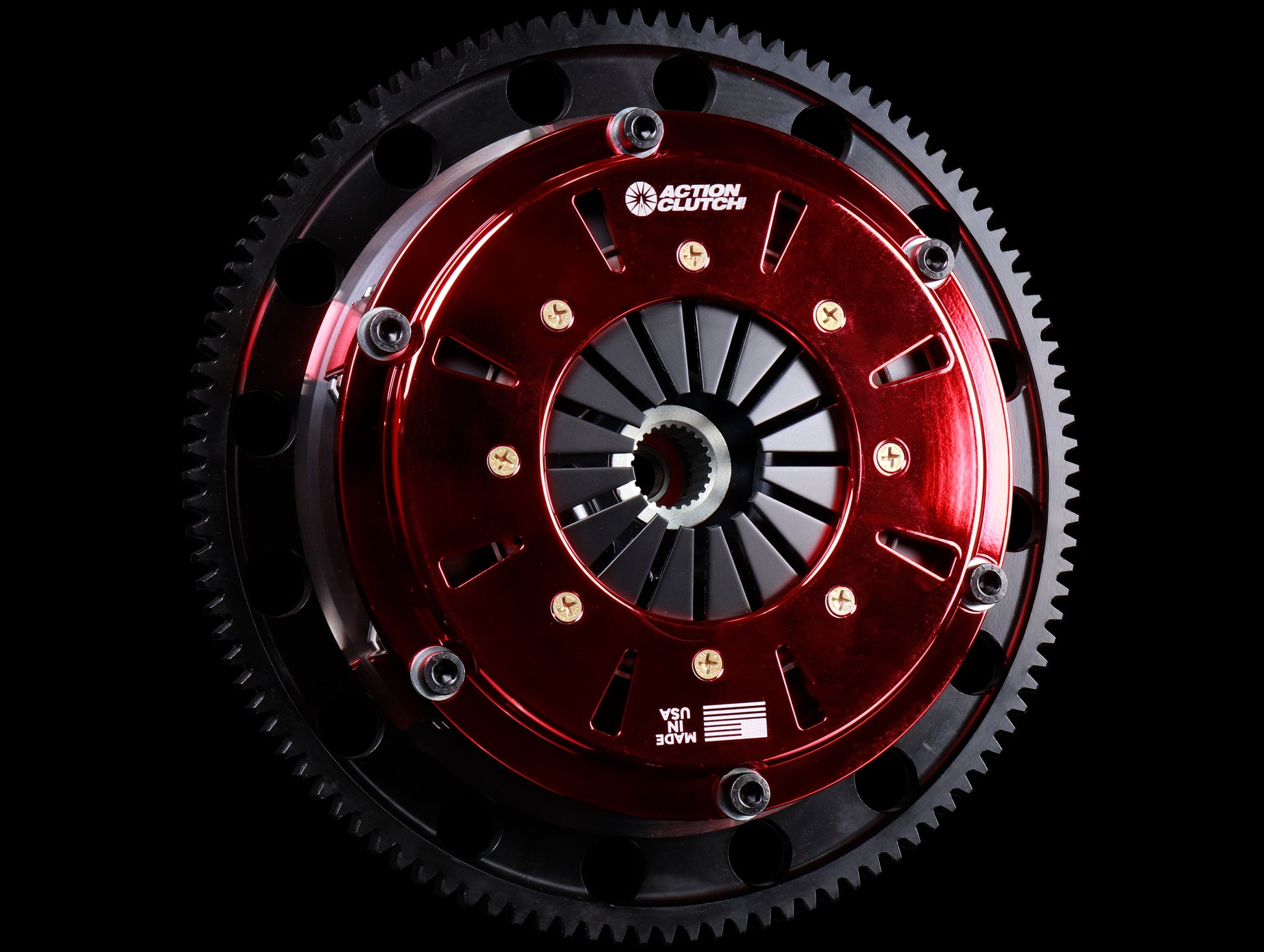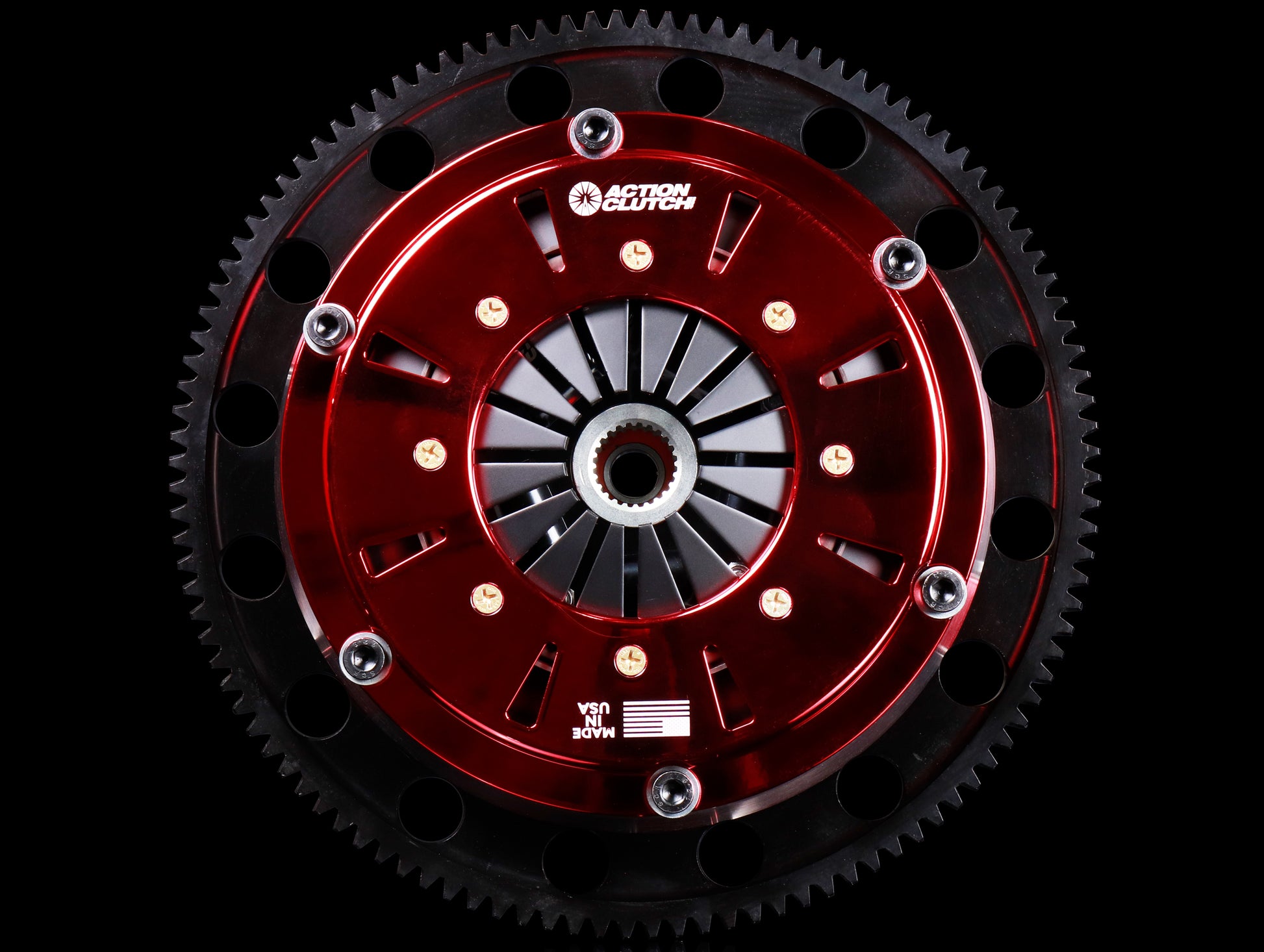 Action Clutch multi-disc racing clutches are designed for high performance racers who push their vehicles to the limit. The 7.25in Twin Disc race kits feature two sintered metallic race discs, formulated in the USA, which offer superior heat capacity and a smoother engagement than any other disc on the market. It also comes with a Ventilated 6061-T6 Billet Aluminum clutch cover design to help reduce overall weight and improve throttle response which is paired with our high strength steel pressure and floater plate. This added clamping force won’t require twice the pedal pressure.