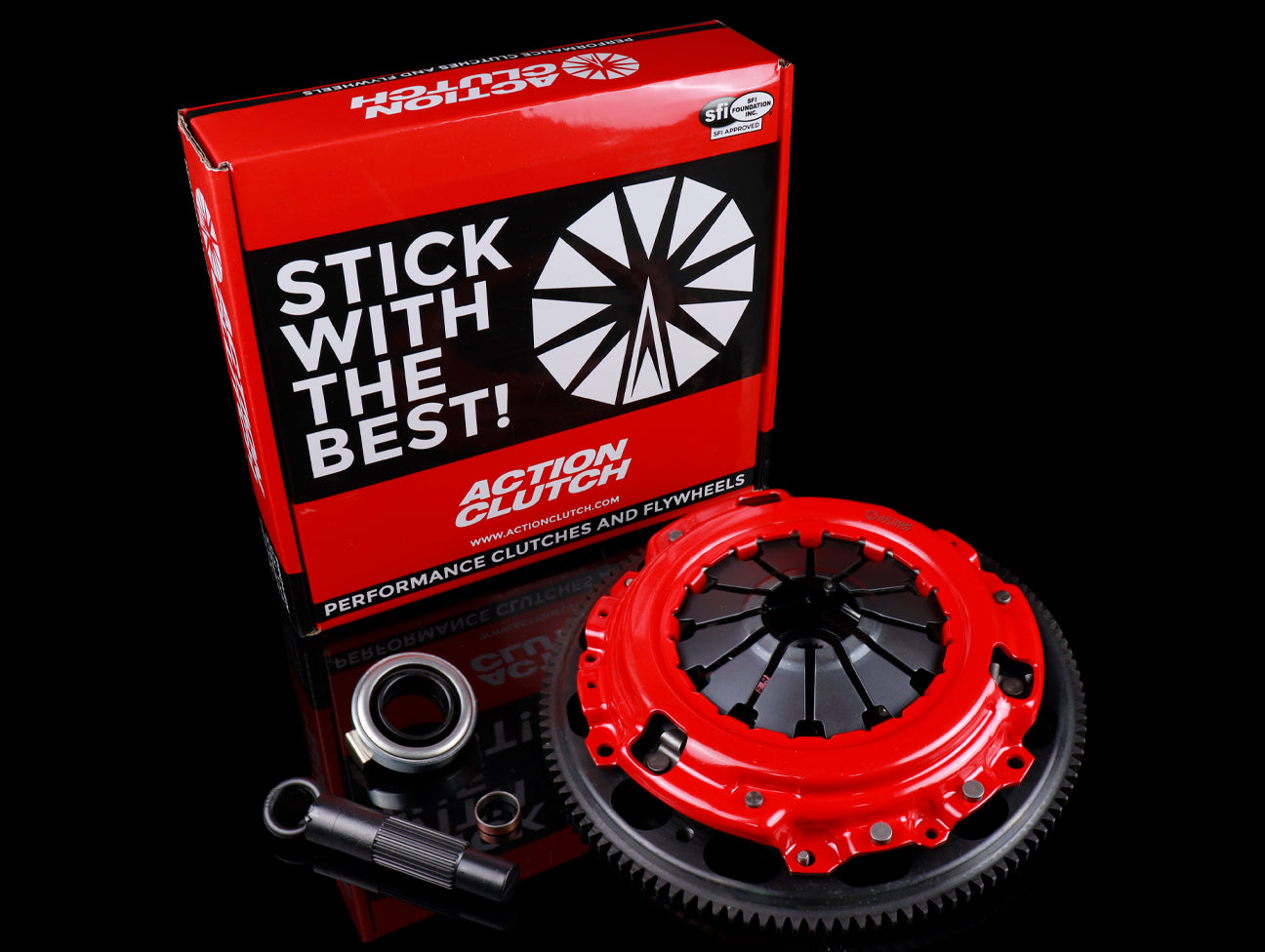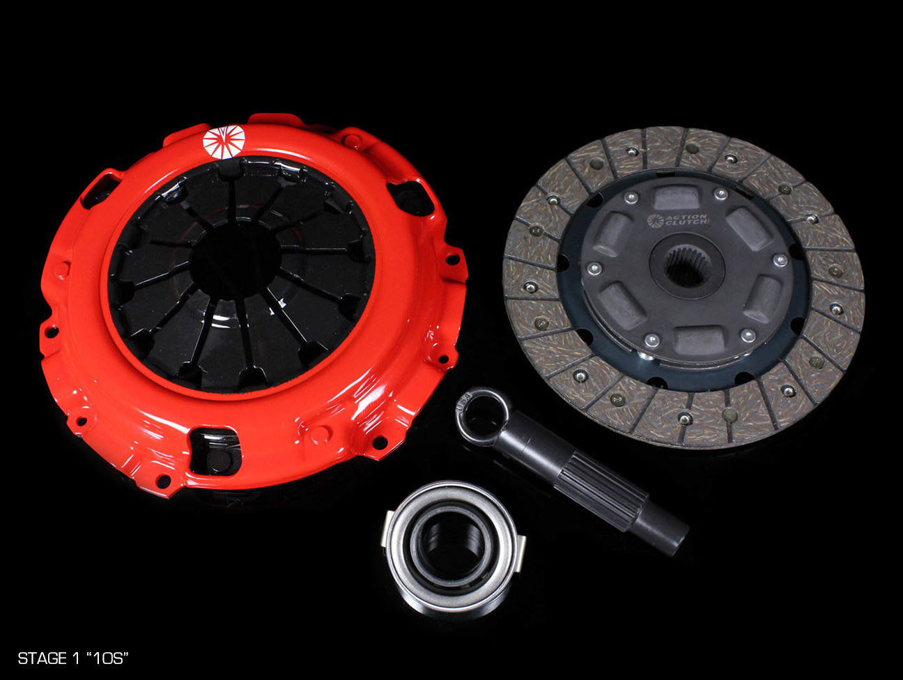 Action Clutch Stage 1 "10S" clutch kit features a single diaphragm heavy duty pressure plate mated to a reinforced organic sprung disc. The clutch kit is engineered for naturally aspirated vehicles with bolt-ons who encounter heavy-duty street use. A significant increase in clamping force is obtained, while still retaining OEM driving characteristics. The clutch features a slight increase in pedal pressure, smooth/linear engagement, and extended wear life.