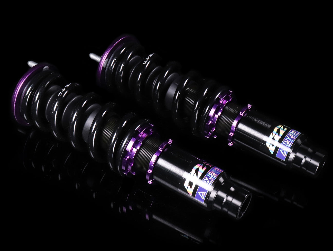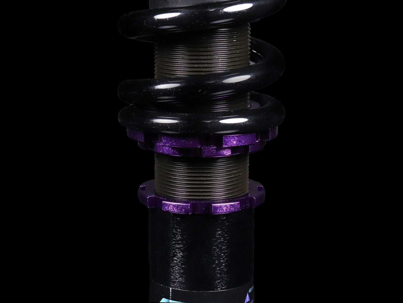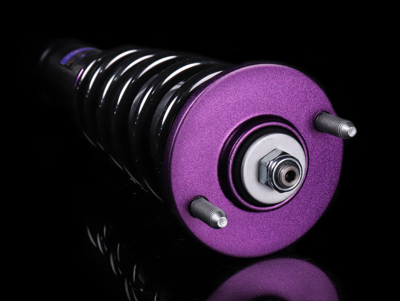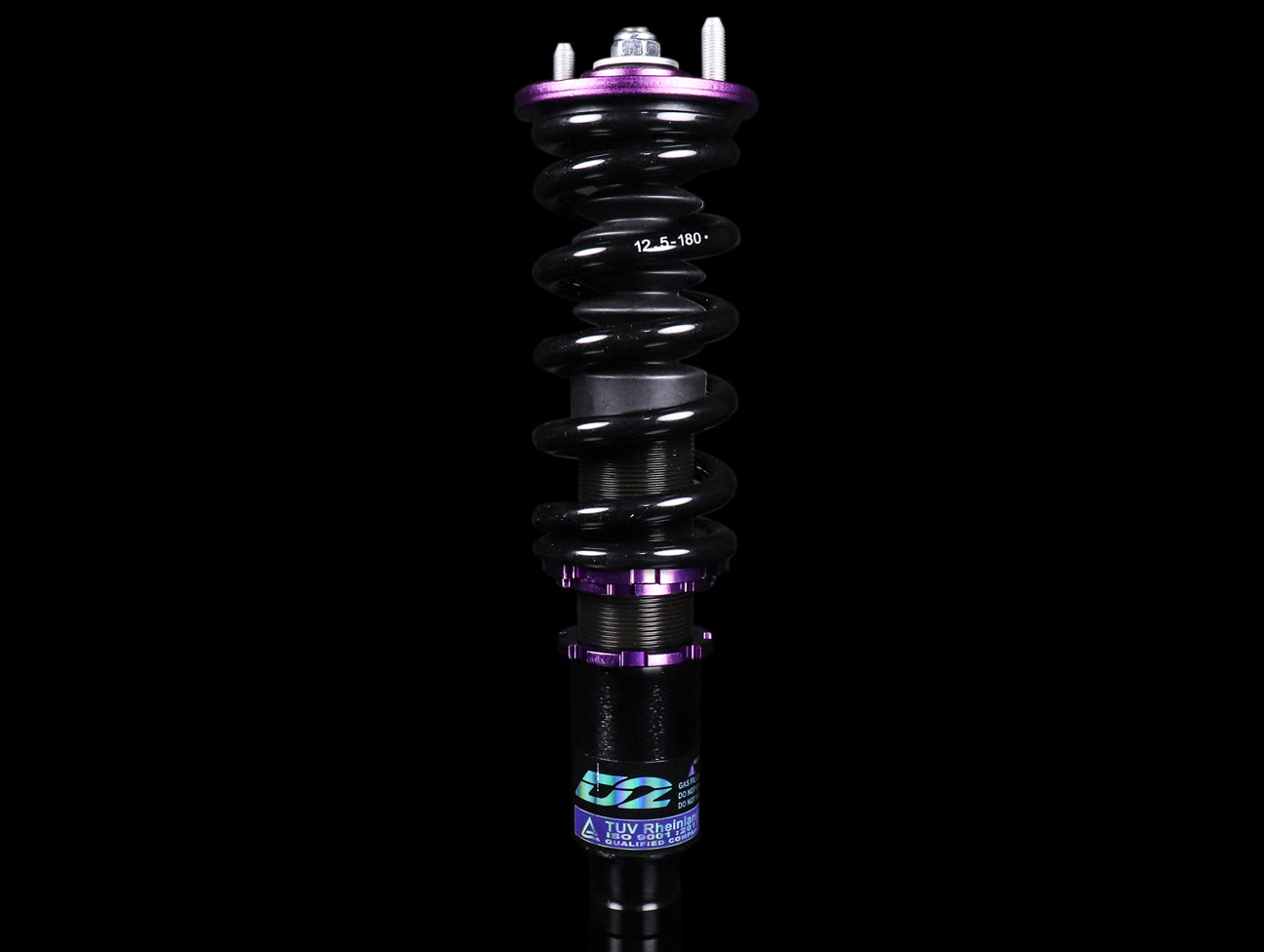 D2 Racing Sports (RS) Coilover System is perfect if you are looking to fully customize the vehicle's suspension system. The impressive features include fully adjustable 36-way mono tube dampening system, custom spring rates ranging from 3 to 22 kg/mm, easy ride height adjustments with Teflon coated spring perch (which allows a drop of up to 120mm on most applications, and the option to adjust camber with 6061 powder-coated aluminum camber plates and upper pillow ball mounts.