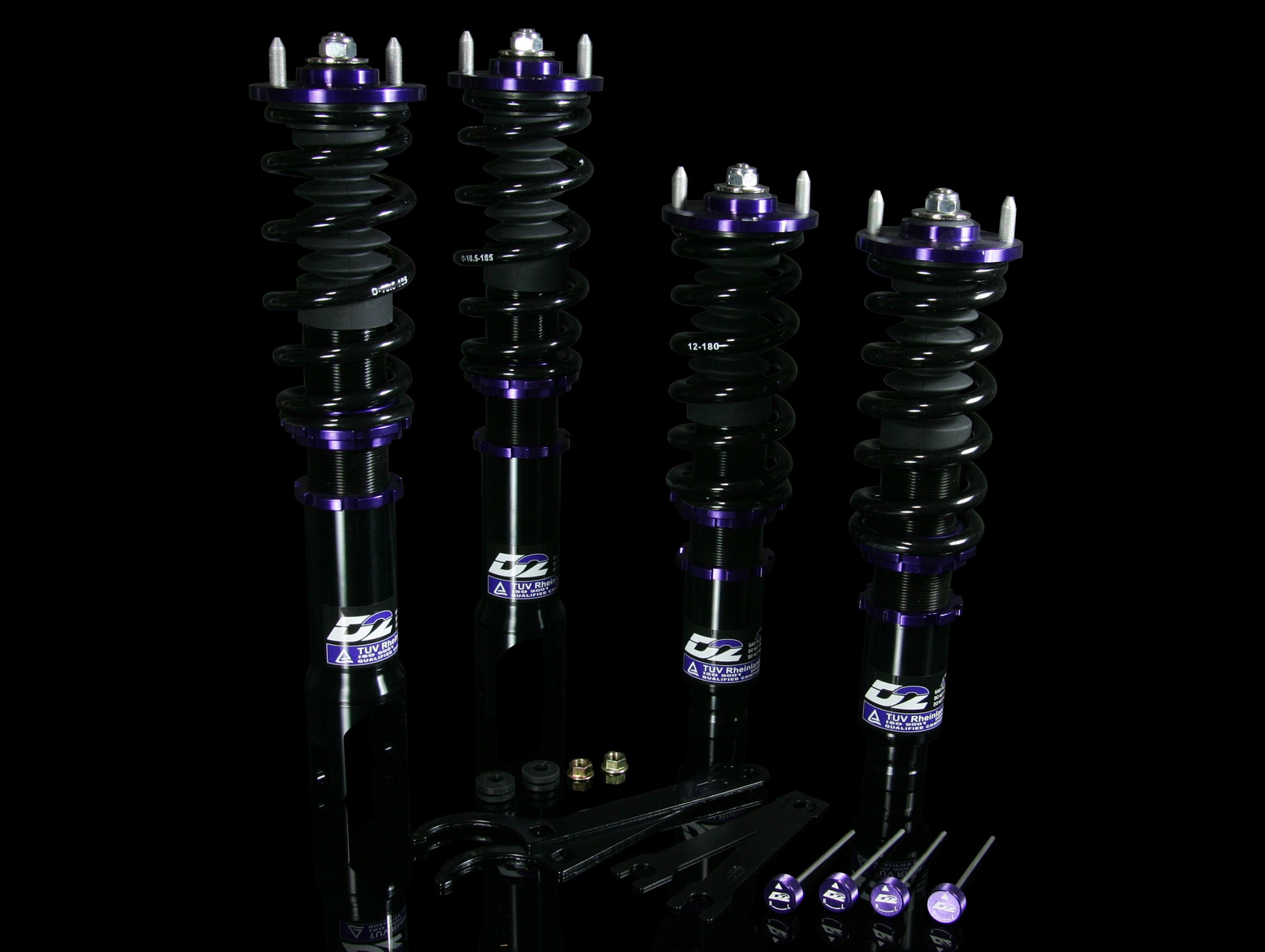 D2 Racing Sports (RS) Coilover System is CNC-machined and satisfies the high manufacturing standards. Its easy design means that the system is fully rebuild-able and serviceable in the USA. The coilover kit includes all the suspension components that discount any compatibility problem between springs and shocks.