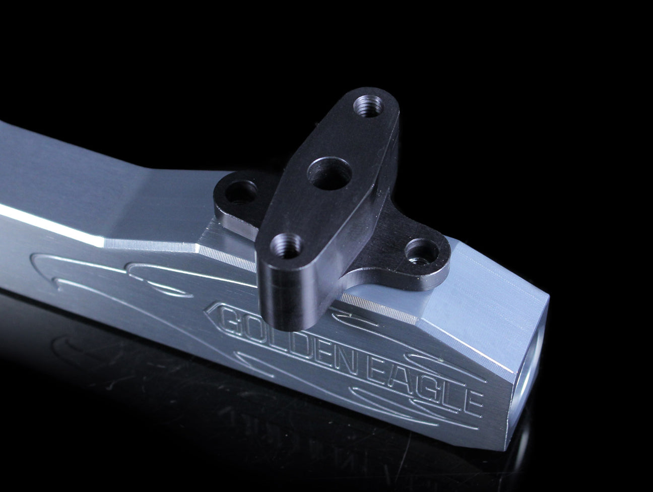 Golden Eagle's 90 degree fuel regulator adapter is precision CNC machined from 6061T6 billet aluminum. Turns fuel regulator 90 Degrees from stock position Use if your stock fuel regulator has clearance problems after installing an aftermarket fuel rail.