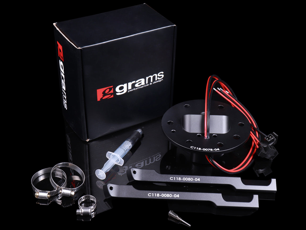 Solve your fuel delivery woes and break that 500hp limit (up to 600hp with the stock fuel system)! the new GRAMS Performance & Design Honda/Acura Dual Fuel Pump Hanger allows you to mount two fuel pumps inside of the factory fuel tank for your high-horsepower naturally aspirated or forced-induction EFI vehicle. The system features CNC-Machined 6061 Billet Aluminum material that is in turn anodized for a long-lasting protective finish that is also E85 compatible.