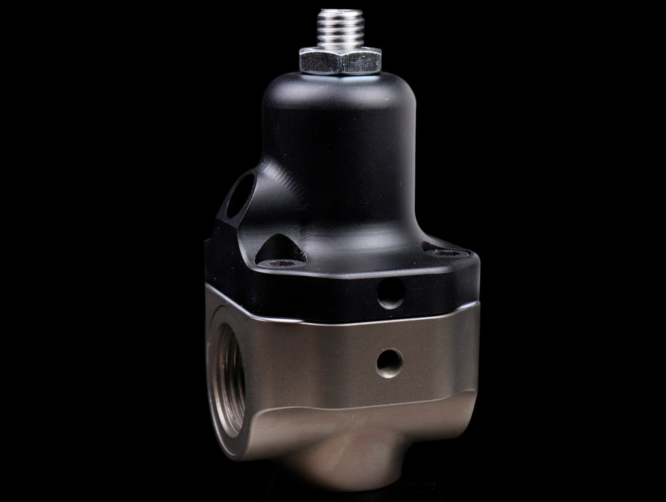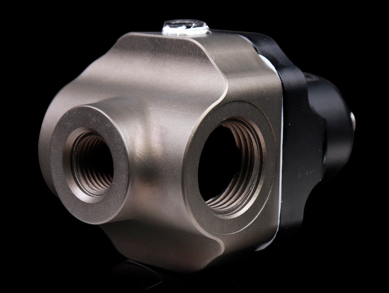 Control your fuel system with the Grams Performance fuel pressure regulator. These regulators feature a black anodized top and high quality 6061 hard anodized aluminum bottom. At the heart of the regulator is a durable custom diaphragm, a stainless steel internal orifice, and a high pressure spring that allows for pressure adjustment ranging from 30 - 118 psi (2 – 8 bar). Each regulator features two AN -10 ORB inlets, one AN -06 ORB outlet, boost/vacuum port, gauge port and provisions for a mounting bracket.