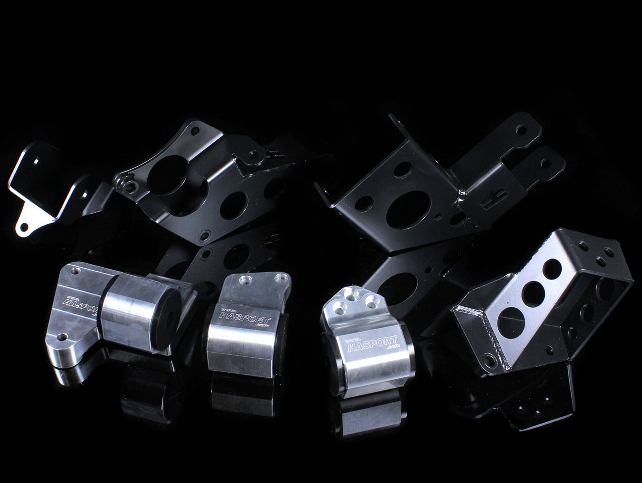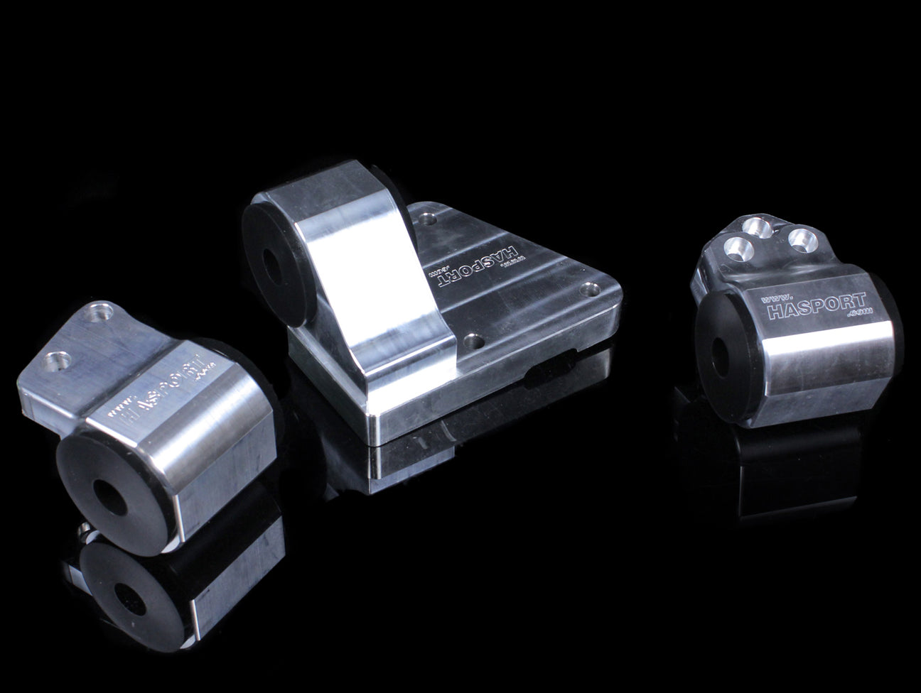This 3rd iteration of Hasports 96-00 Civic K-series engine mount kit is specifically designed to utilize a (K24) Accord or TSX transmission. K24 transmission's have different mounting points than a traditional K20 transmission. Complete kit includes billet mounts, brackets, mounting hardware, and instructions.