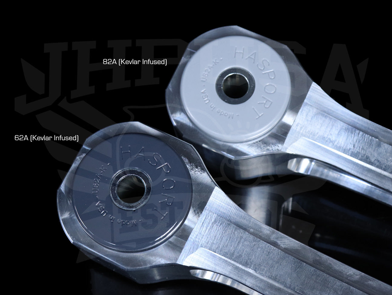 This mount also has Hasport's new BULLETPROOF™ Kevlar® infused polyurethane bushing for added shear strength specifically for 62A and 82A durometers. These bushings feature Hasport’s flangeless design which have decreased vibration compared to the flanged urethane bushings but are much more durable than the tapered bushings found in our competitors mounts.