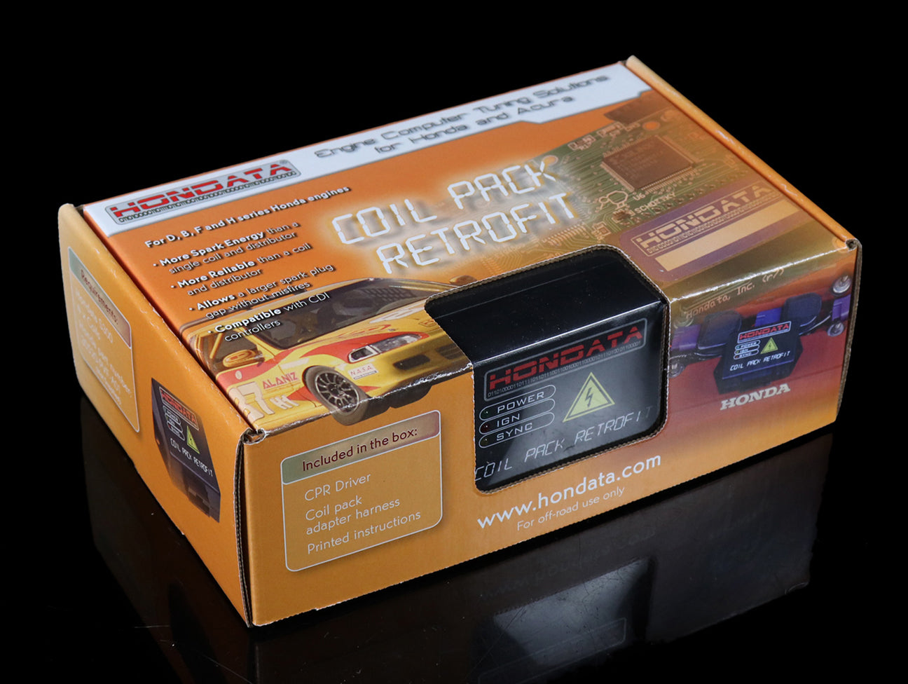 The Hondata Coil Pack Retrofit (CPR) allows the use of 'coil on plug' individual ignition coils on engines with distributor based ignition systems (D, B, F and H series Honda engines). It does this by replacing the stock coil and ignition with an electronic circuit which can drive igniter type individual ignition coils, such as used on later model Honda engines. A Hondata S300 system and US OBD-1 ECU is required.