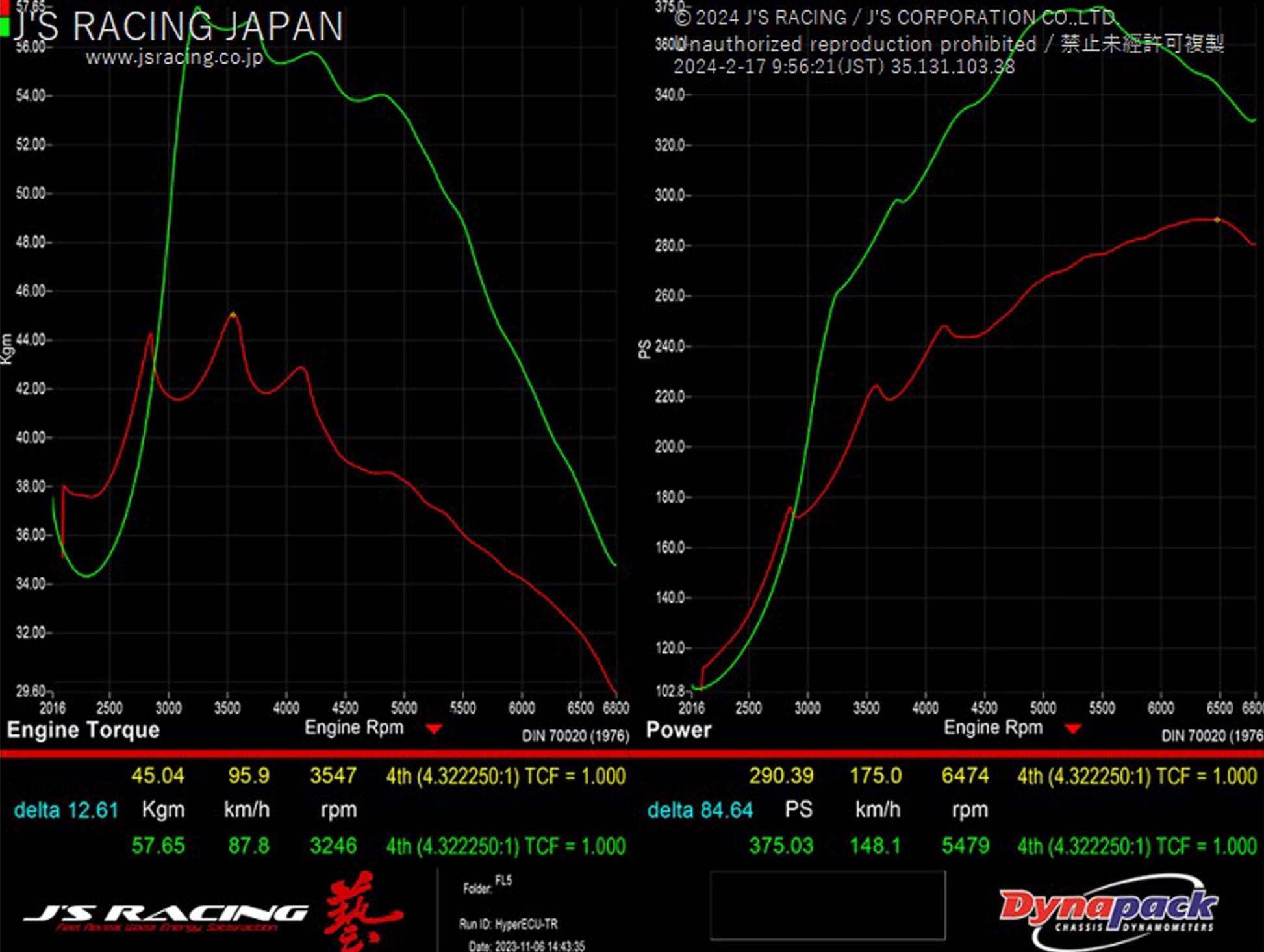 - The power graph in the image was measured with an intercooler and FL5 HYPER-ECU option for intercooler (JS-N-L5-ICR).