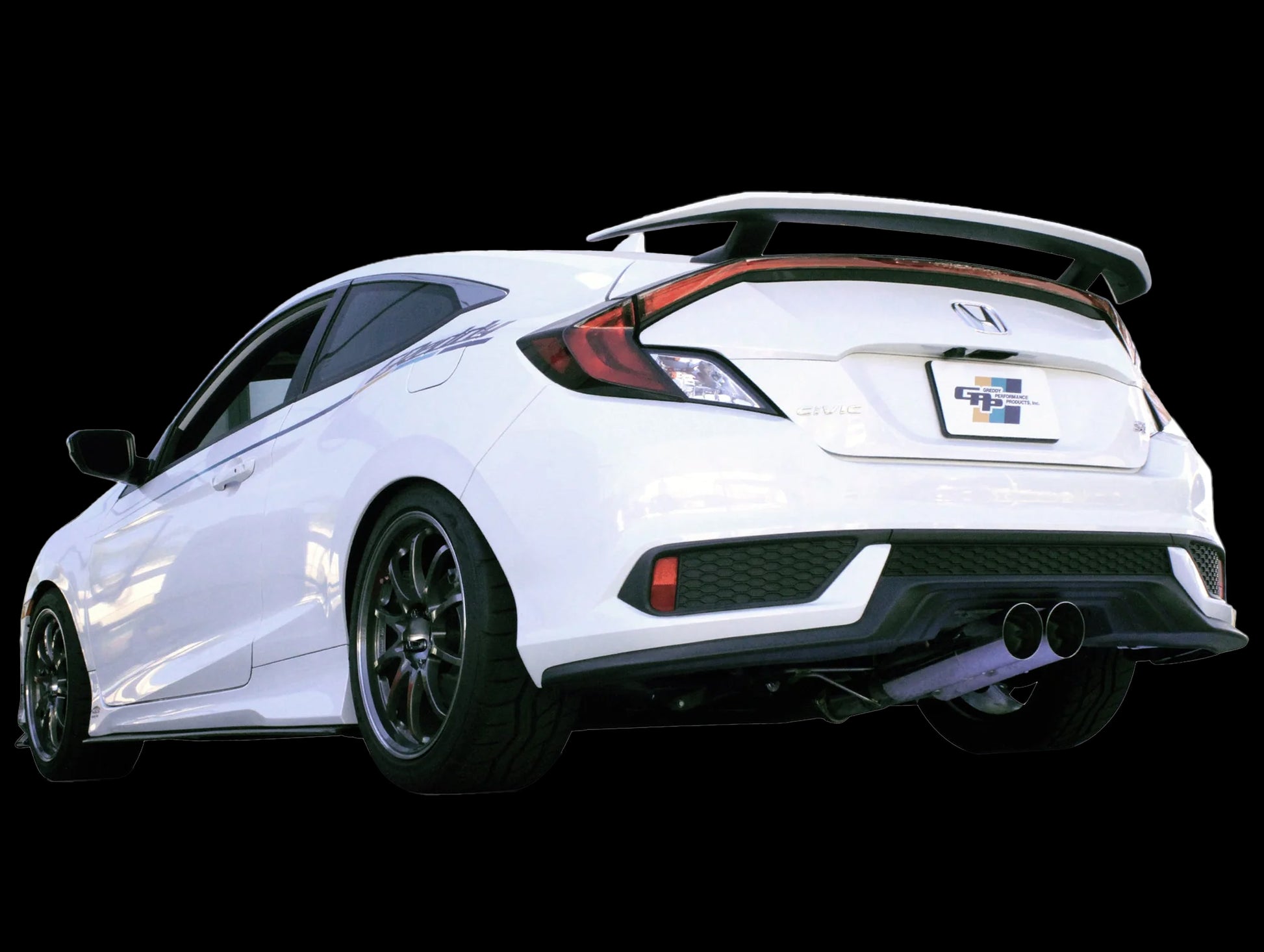 The DD-R compact dual muffler exhaust for the Honda (FC3) Civic Si coupe is designed for owners who desire a high quality, free-flowing exhaust with aggressive looks and sound to match. This full stainless-steel cat-back system begins after the front over-pipe with a 76mm (3”) front-pipe with tucked resonator to a full 3” mid-pipe all the way back to the rear section. The 3” piping then splits to two large 63.5mm (2.5”) inlets for the polished, 101.5mm (4”) DD-R mufflers via our precision Y-pipe. The DD-R is finished off with removable dual GPP engraved stainless steel slash-cut tips. The DD-R’s removable tips allow for customization with various optional tips and muffler silencers (sold separately.)