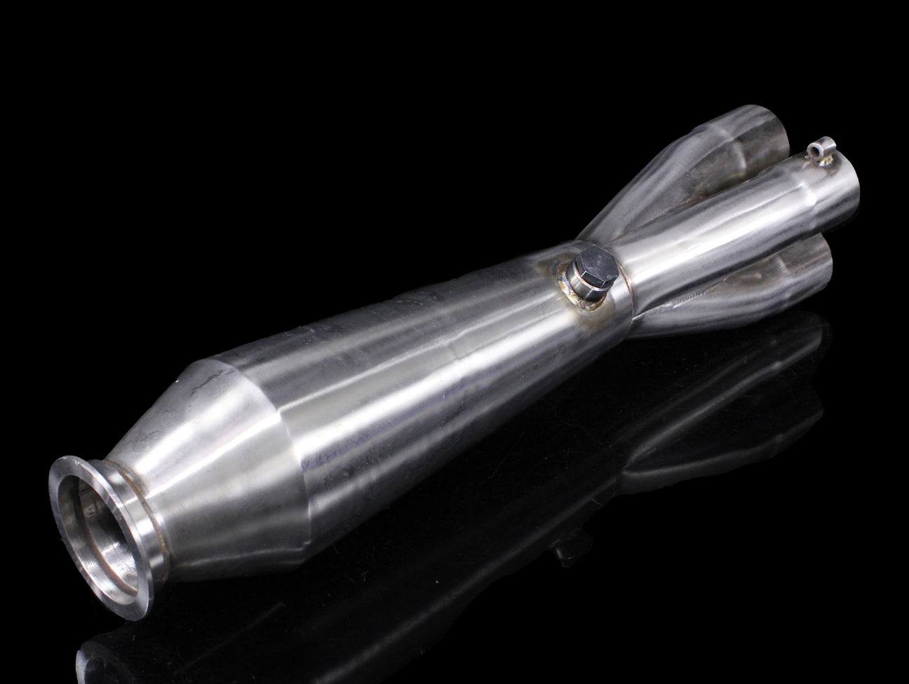 Private Label MFG (PLM) K-swap Megaphone header puts the Bernoulli's principle to work by integrating the V-BAND quick release system to quickly disconnect and reconnect your exhaust system. This header delivers low to high end power while utilizing a two piece design which maximizes the engine compartment space.