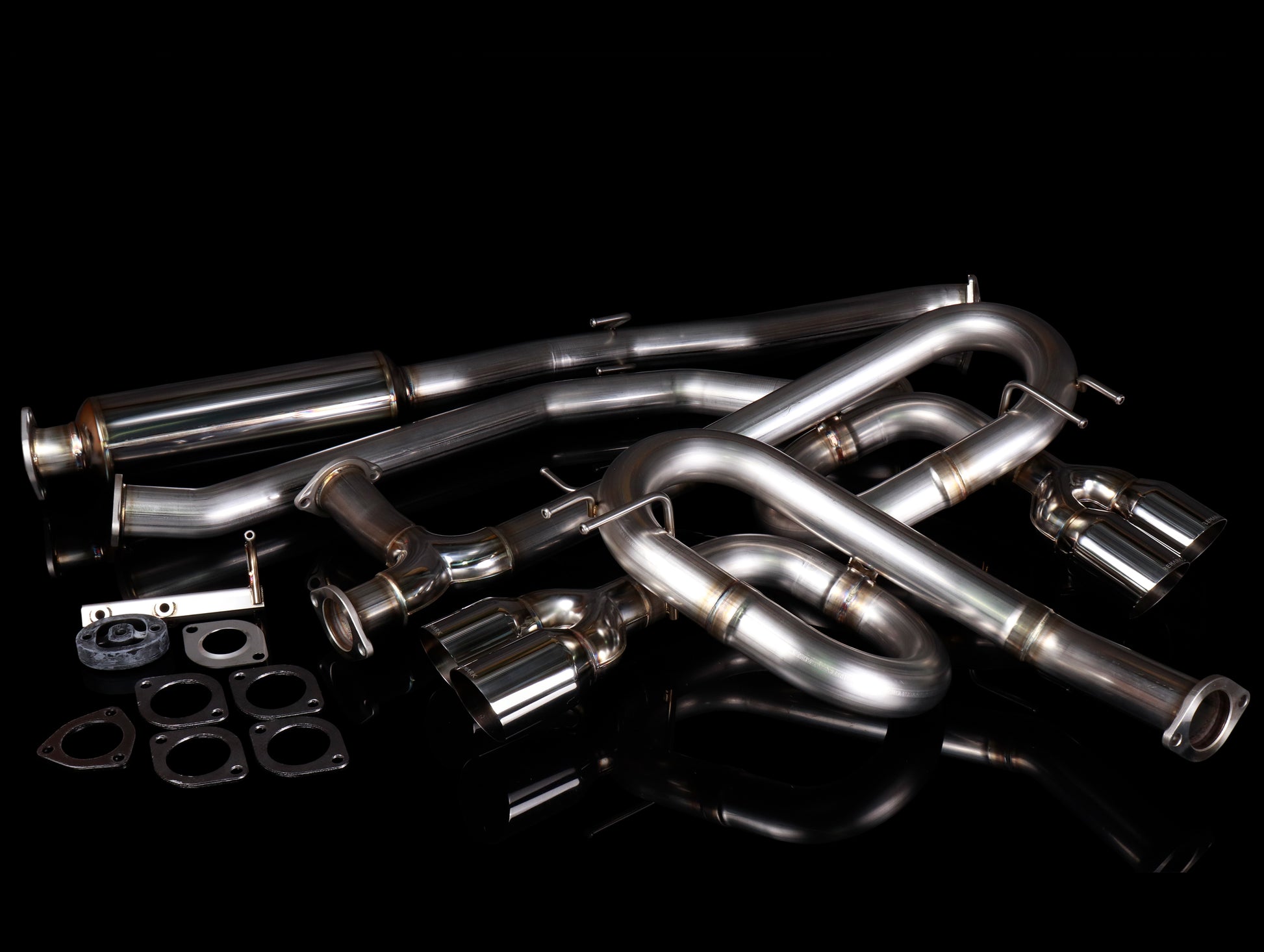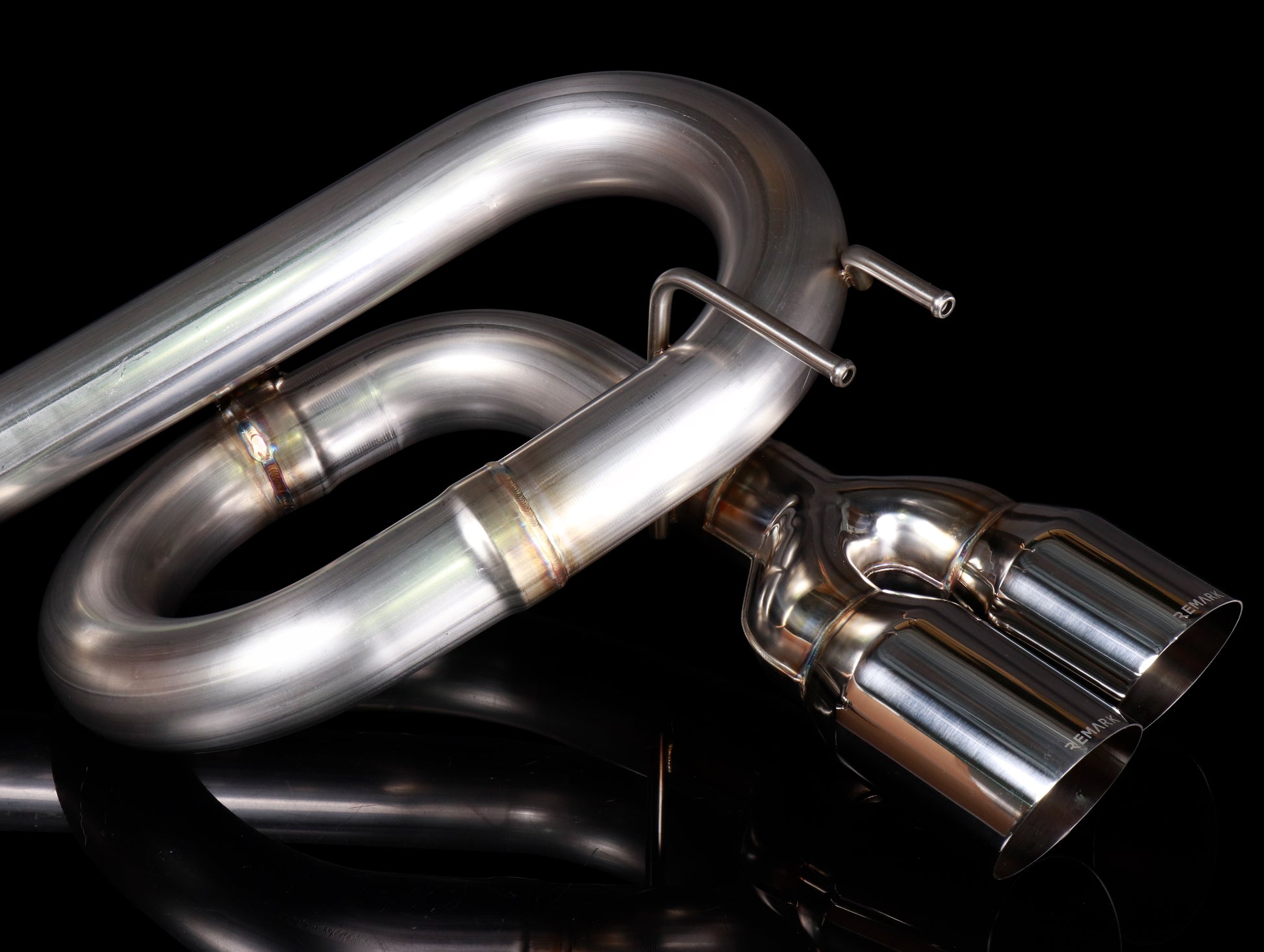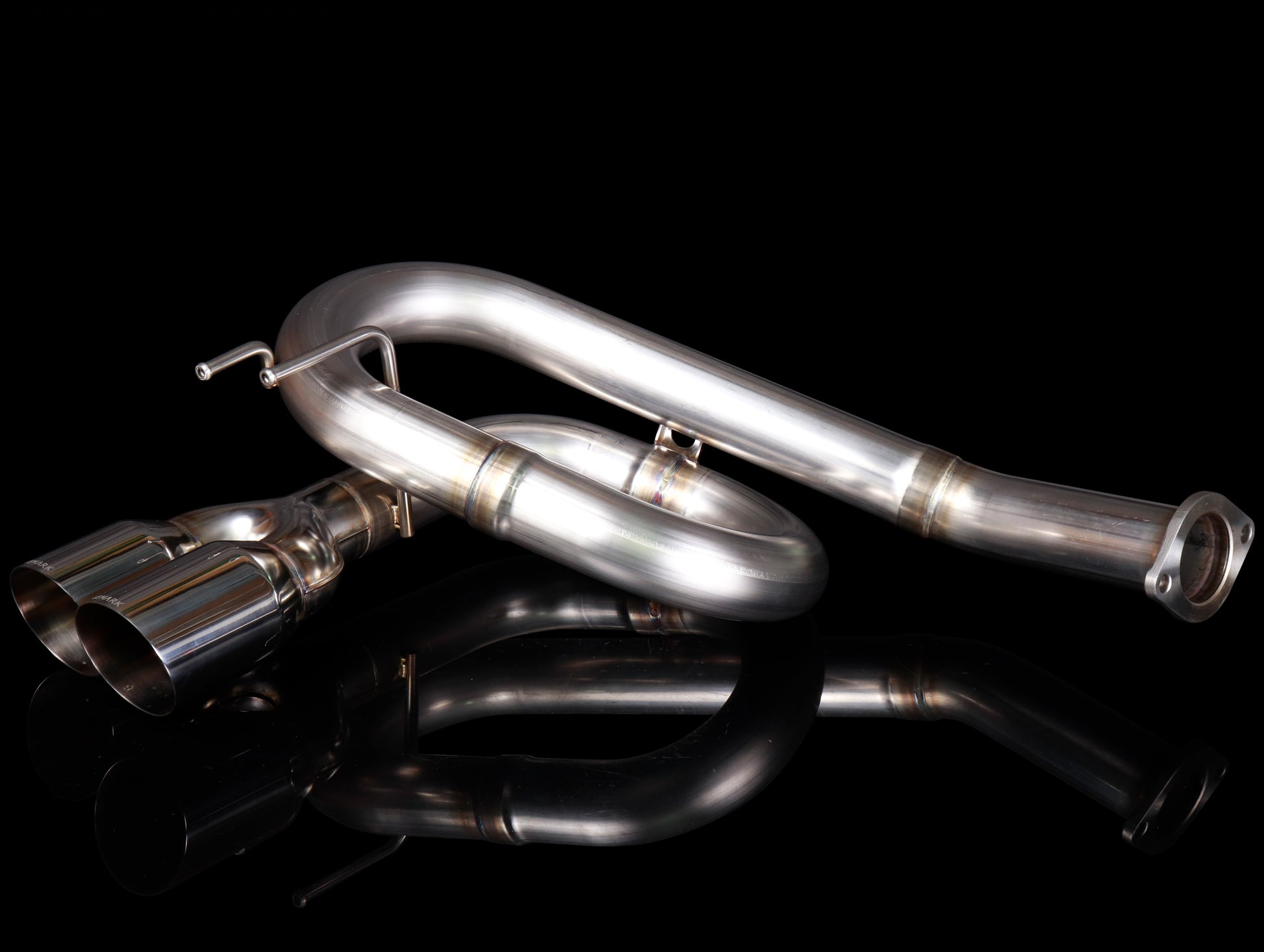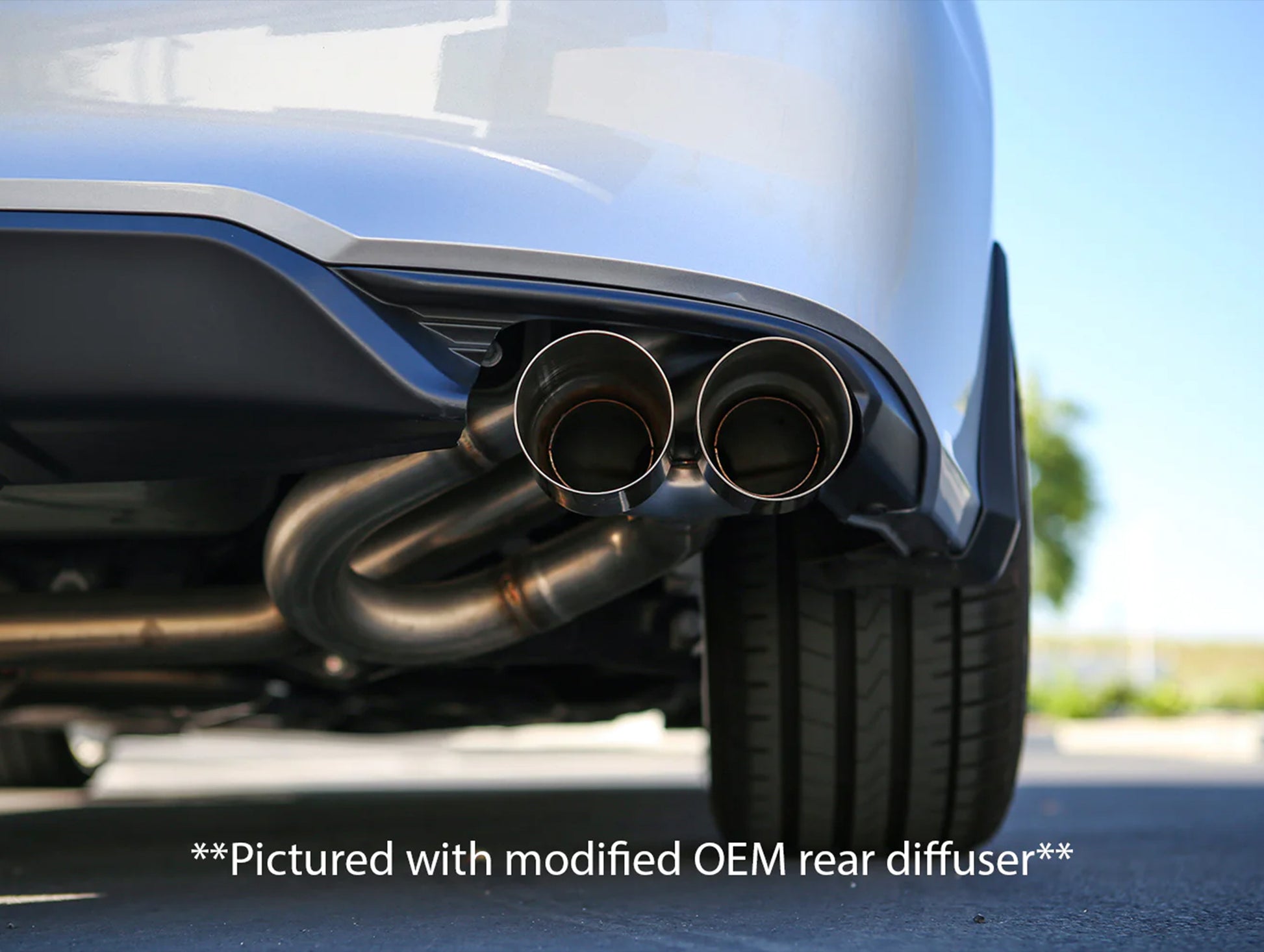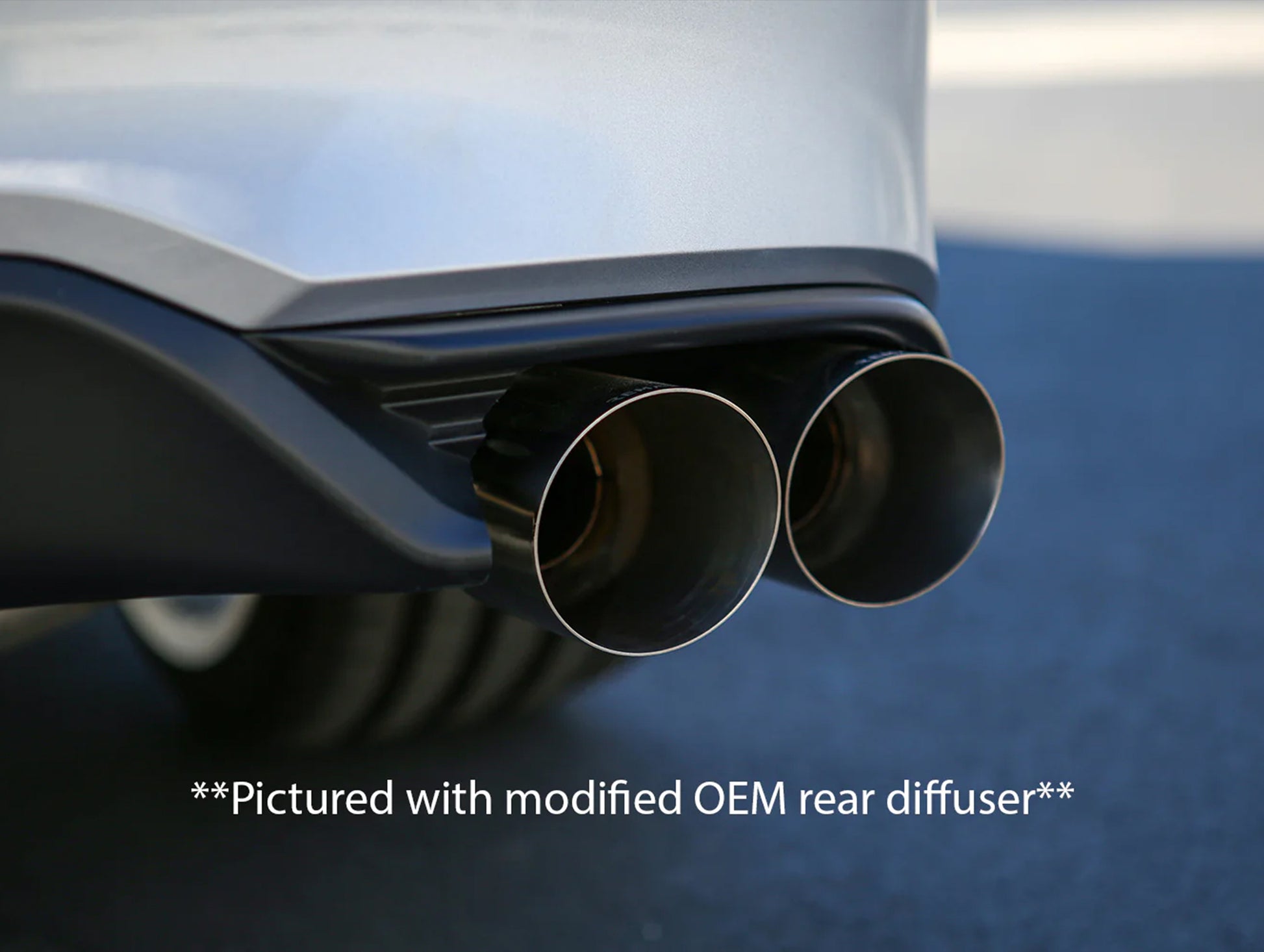 IMPORTANT - modification / trimming is required to install this exhaust. The OEM rear bumper diffuser has no cutouts for exhaust tips. Therefore there are three options required to fit the quad tip exhaust: