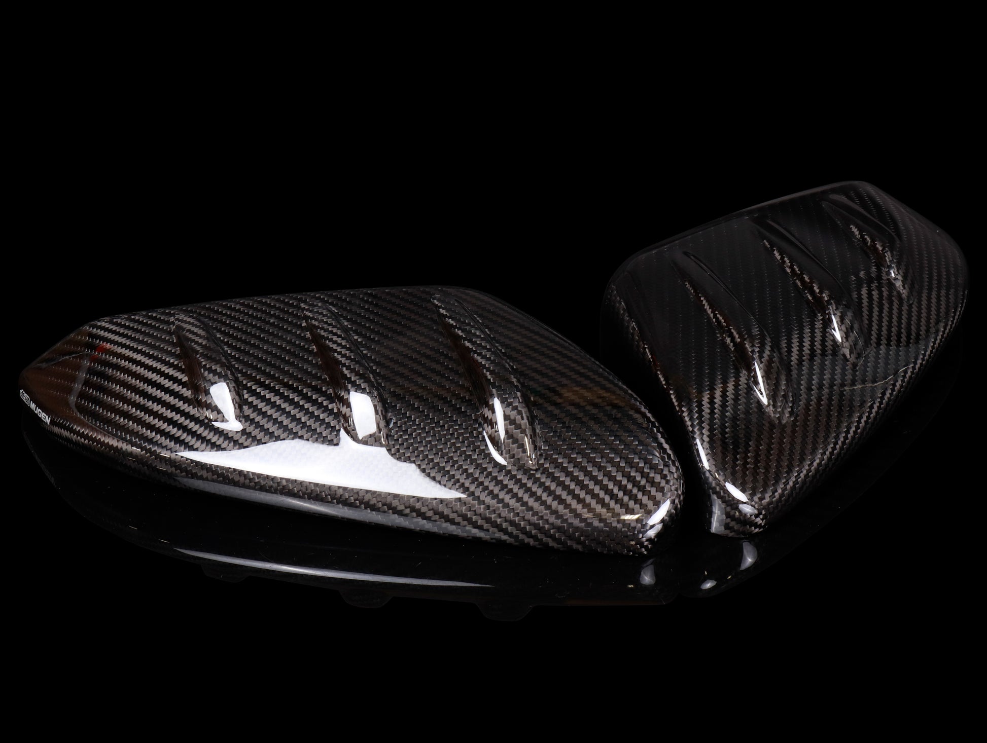 Mugen designed this Carbon Fiber door mirror cover to further control air flow. The Mugen Carbon Fiber door mirror set is finished with UV resistant clear coating which prevents the covers from deterioration including color fading. Dry carbon construction.