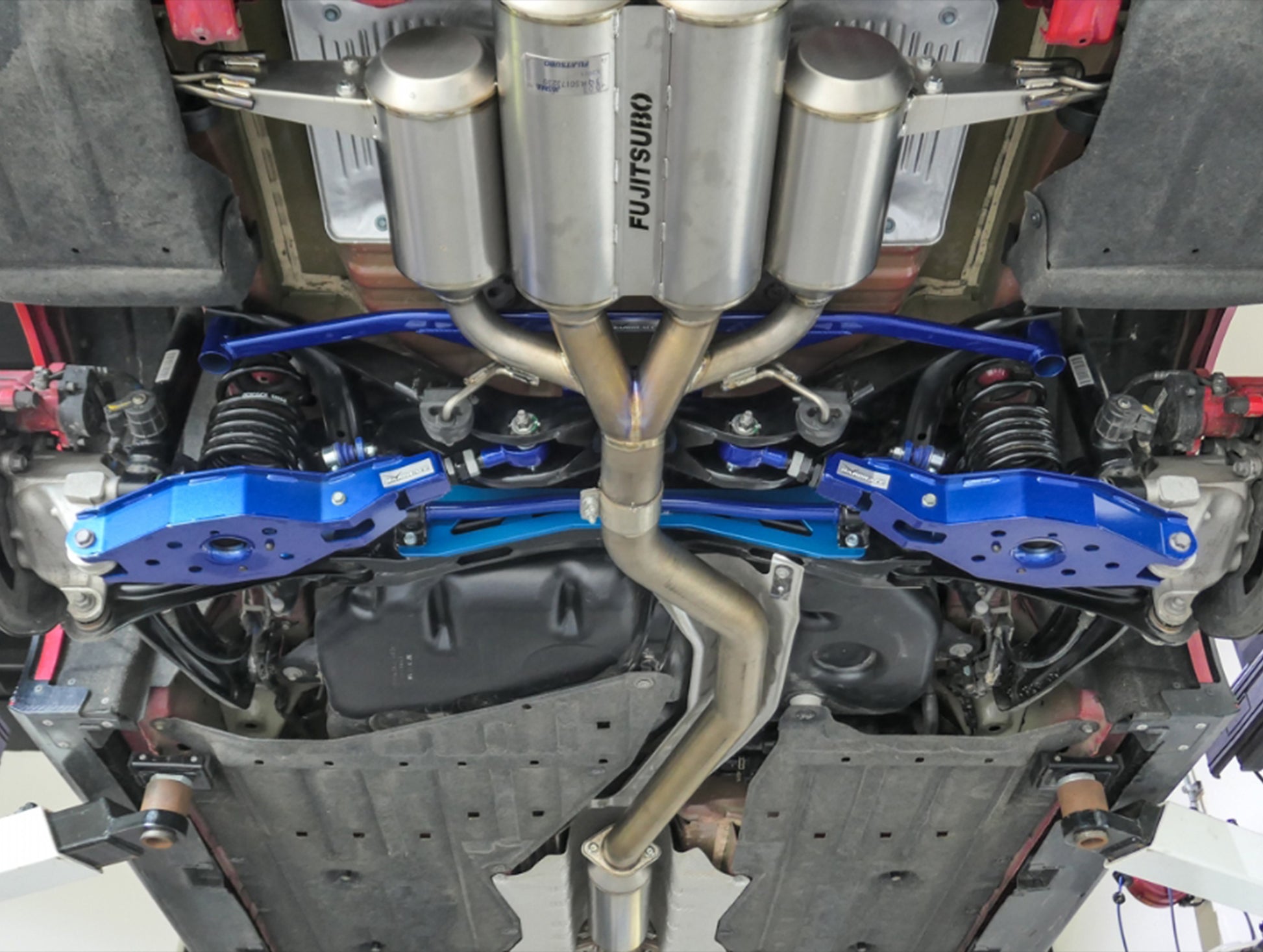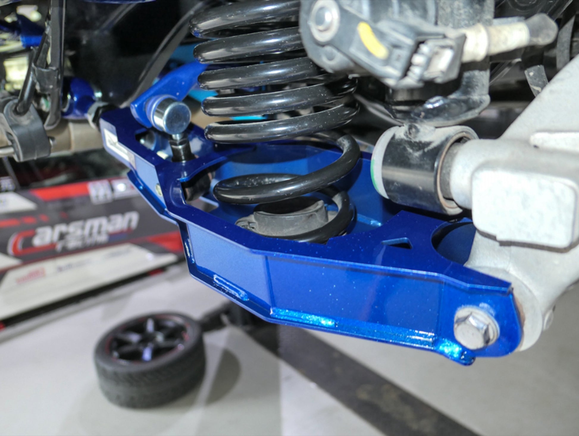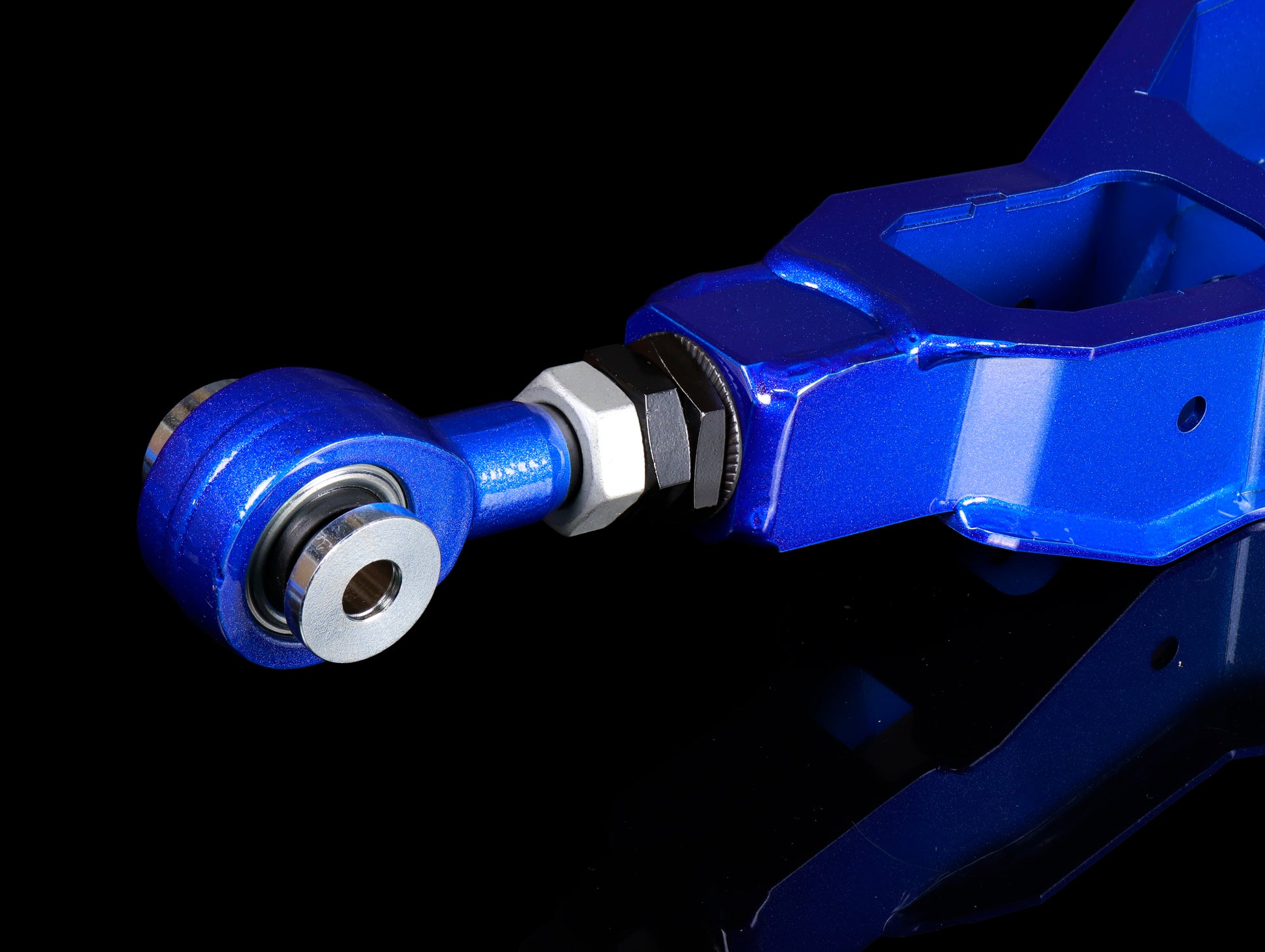 The rear lower arm allows fine adjustment to the rear end camber setting of the vehicle. It can either help maximize wheel contact patch to improve cornering grip or get your car back to original alignment specs after lowering to prevent uneven tyre wear. The arm features improved construction and materials made of boxed steel alloy to offer superior strength, durability over the factory stamped steel pieces. The equipped high quality pillow ball bushings also provide much more solid and precise handling response.