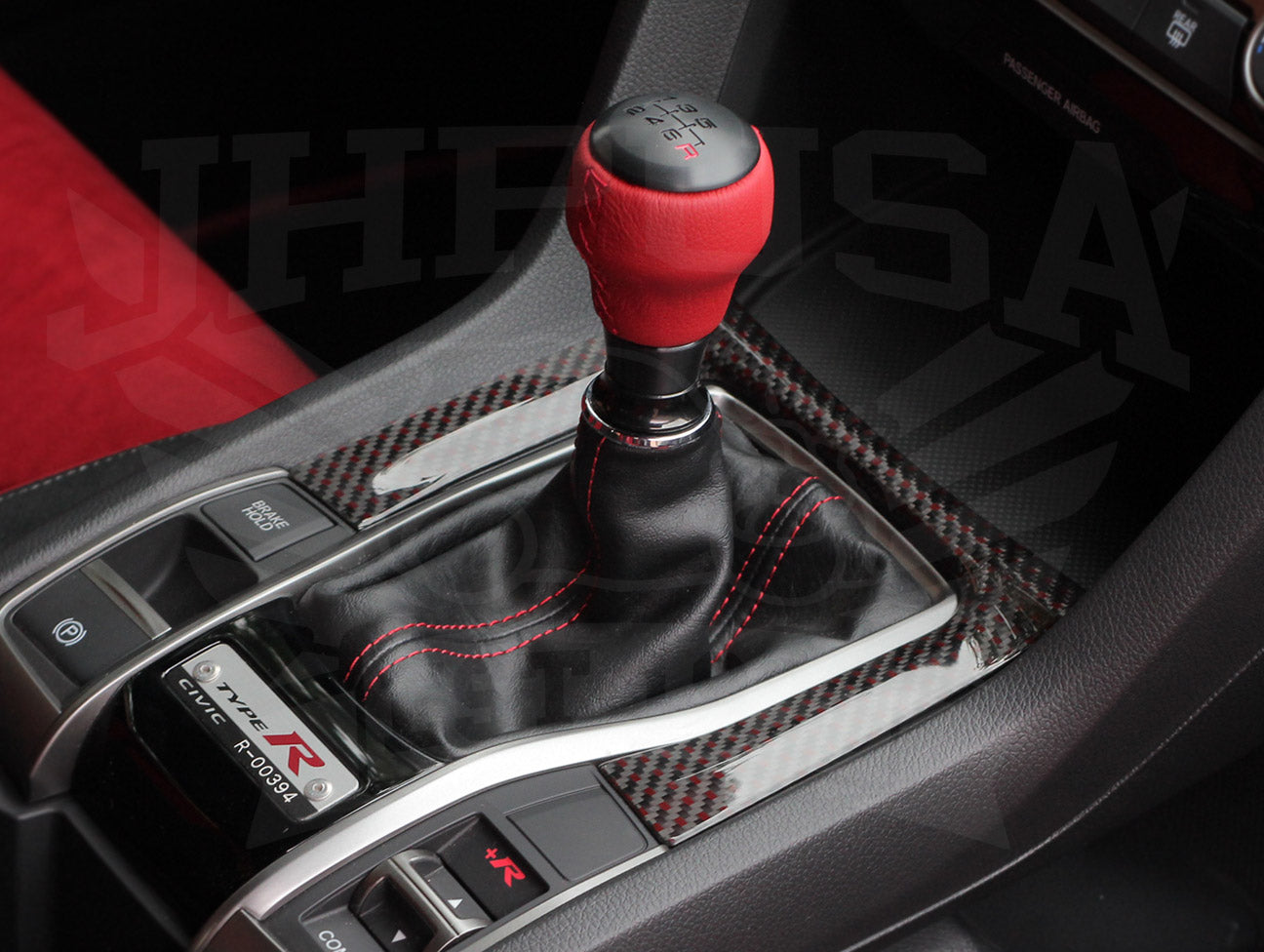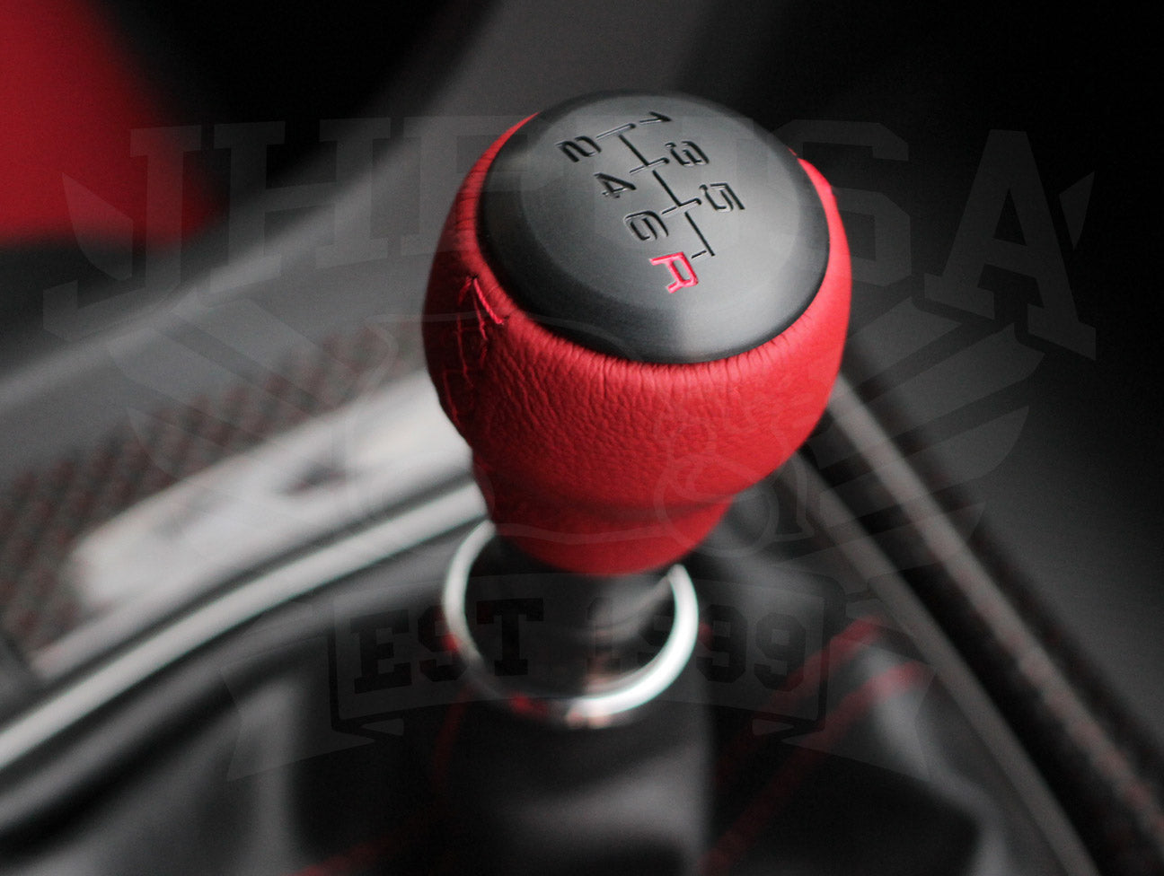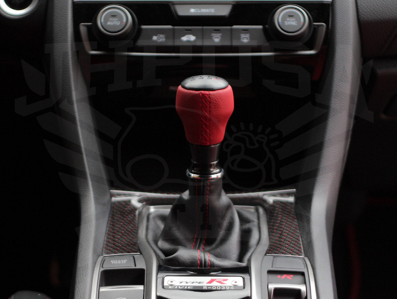This is a genuine OEM JDM Honda Access shift knob for the 2017+ FK8 Civic Type-R. This knob features a textured red leather grip and stitching wrapped around a black alumite. The top of the knob has etched 6-speed shift pattern and a red colored 'R' because you know.....TYPE-R!