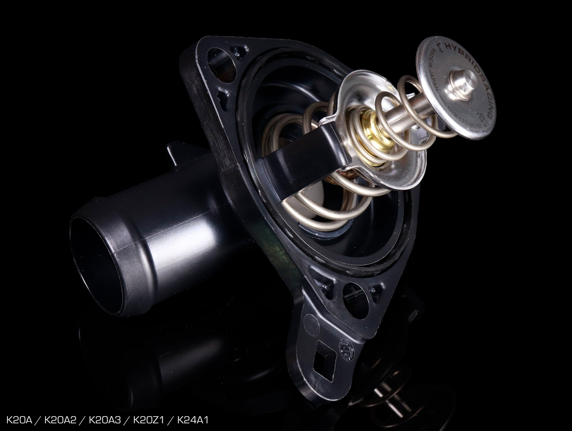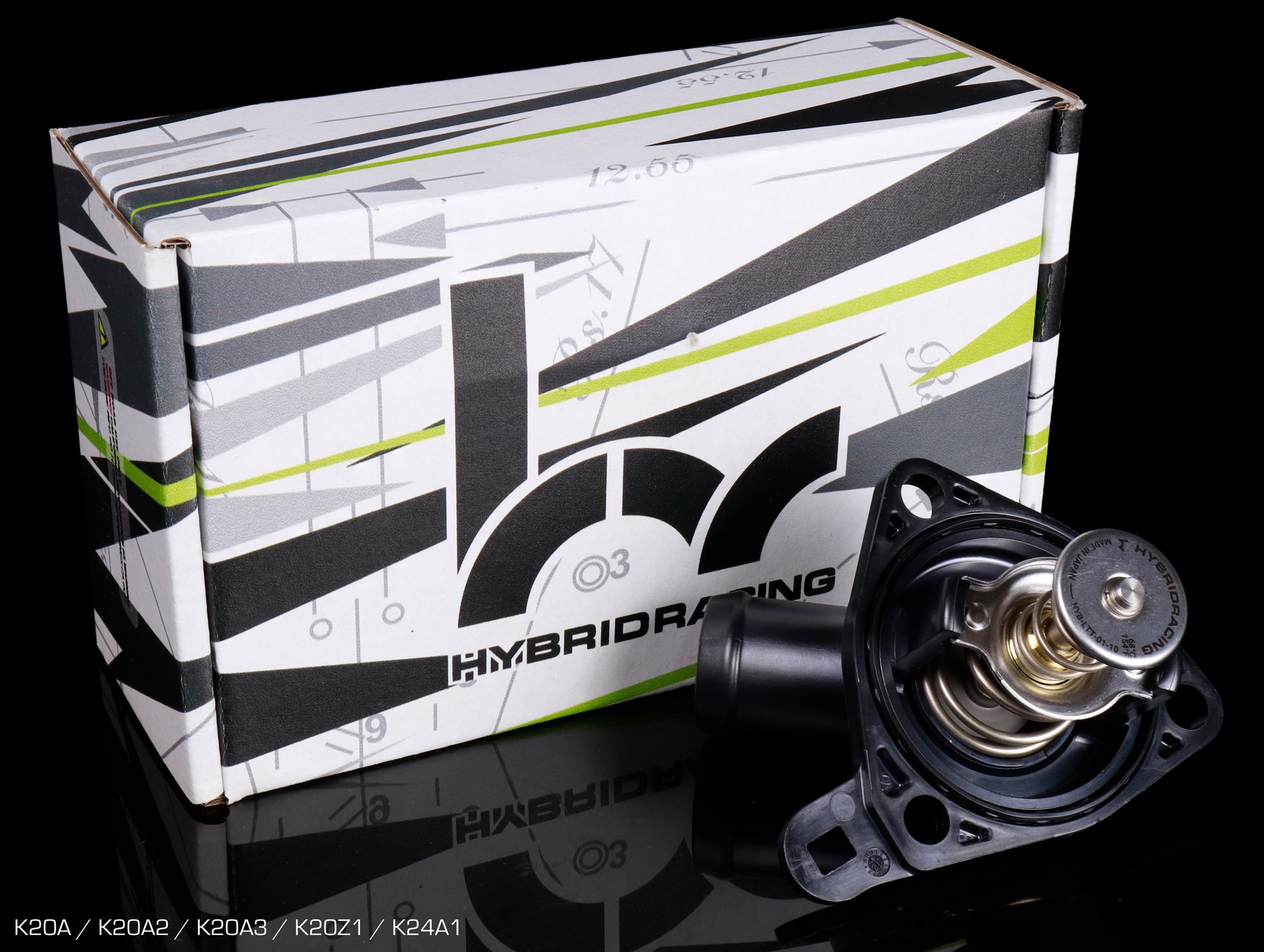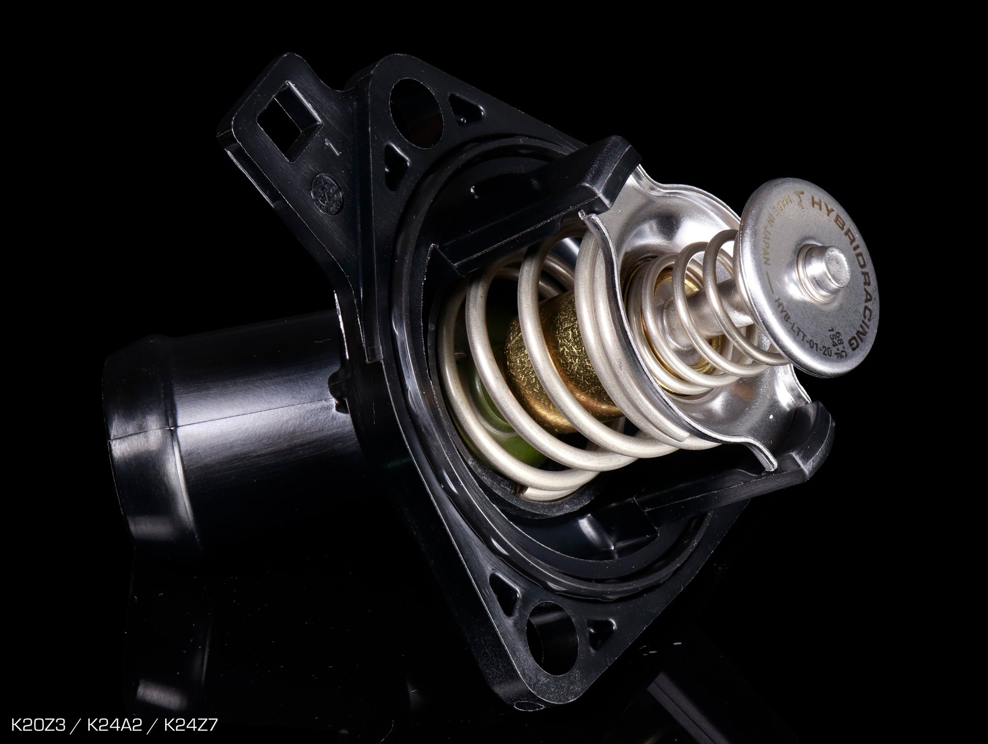 Hybrid Racing knows the advantages of using a low-temperature thermostat in high-performance or race environments are evident. Opening the thermostat's valve at a lower temperature allows coolant to flow more freely during low-load sections of the racetrack. This enables the radiator to effectively regulate the engine's temperature within the optimal range during high-load sections. If a cooling system is pushed to its limits at the racetrack and overheating becomes an issue, a low-temperature thermostat can often resolve this problem. It achieves this by allowing the radiator to perform more cooling at lower engine loads, thereby preventing or delaying overheating during high-engine loads.