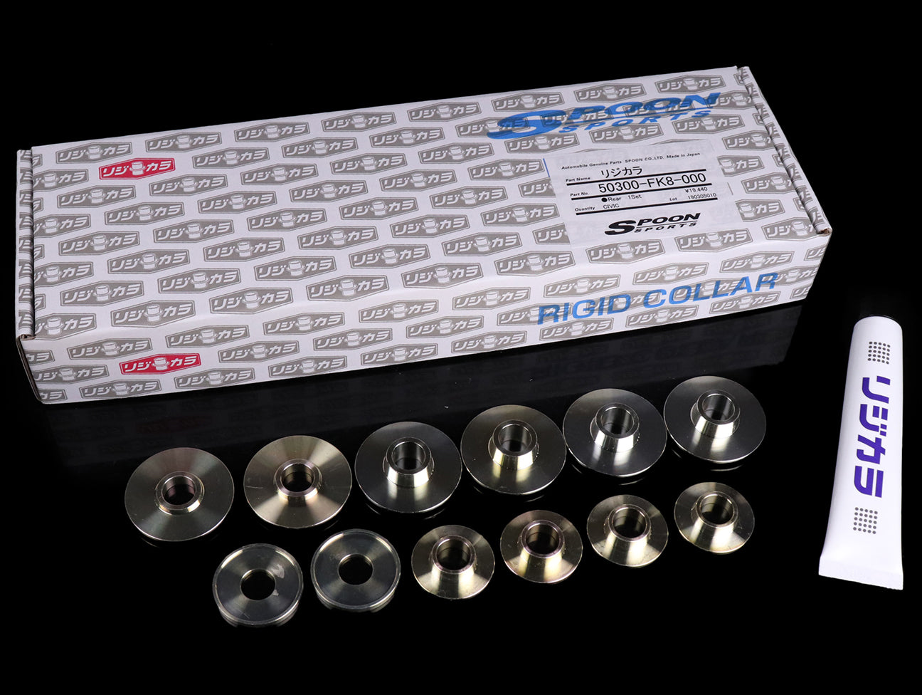 The Spoon Rigid Collar 12-piece stability kit will improve crash safety, lower vibration reduction, prevent tire wear, indoor and outdoor noise reduction improved handling & stability by providing a more precise alignment of the rear subframe-to-body.