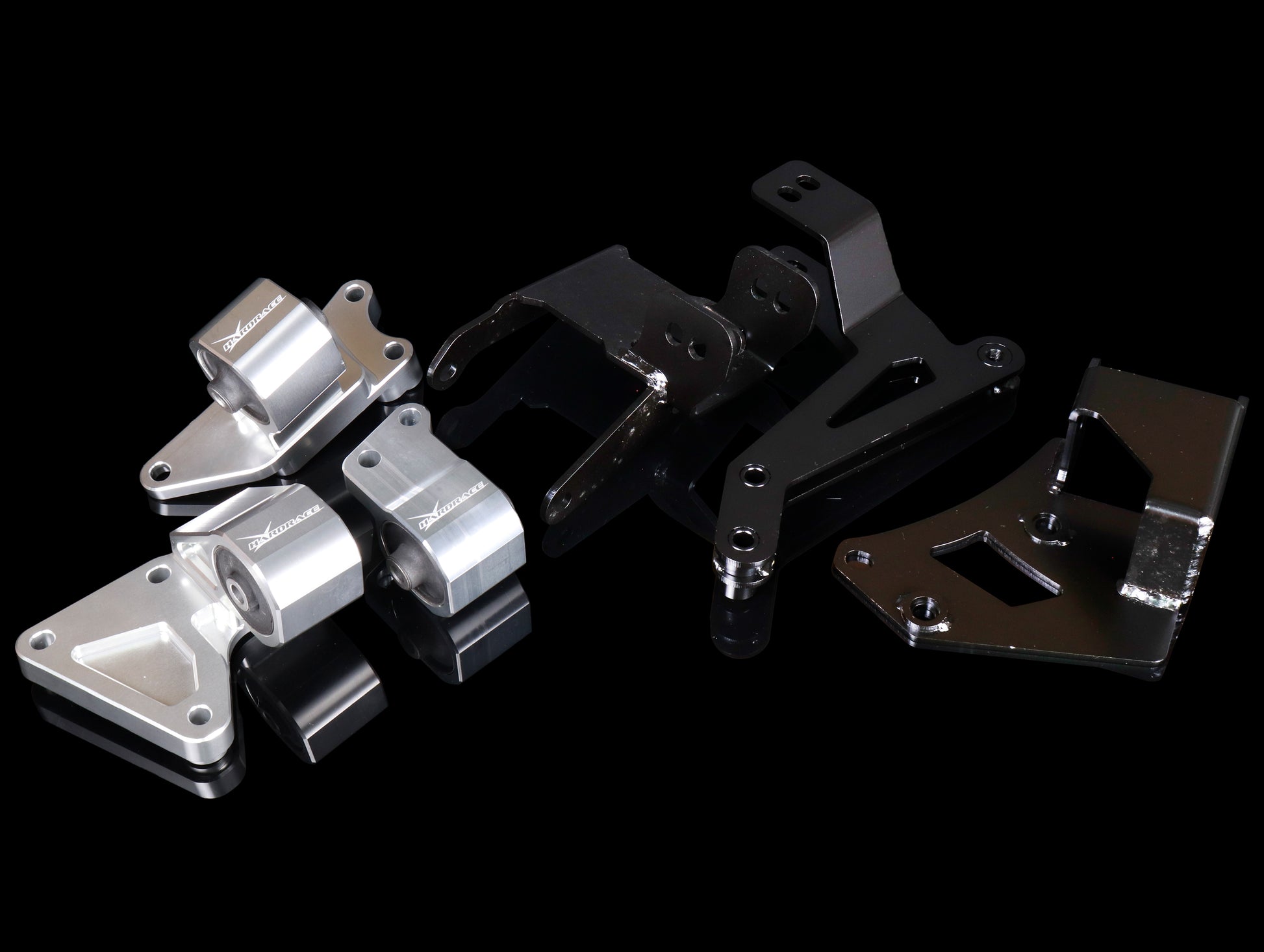 The engine mount kit is required when performing a K-series engine swap into Civic EK. It features a 5mm thick steel alloy construction for the brackets, offering superior strength and durability to withstand higher horsepower and torque output. With the reinforced solid rubber bushings, this kit also eliminates unwanted vibrations and flex of the mounts under hard acceleration, braking and cornering, ensuring maximum transfer of power to the wheels.