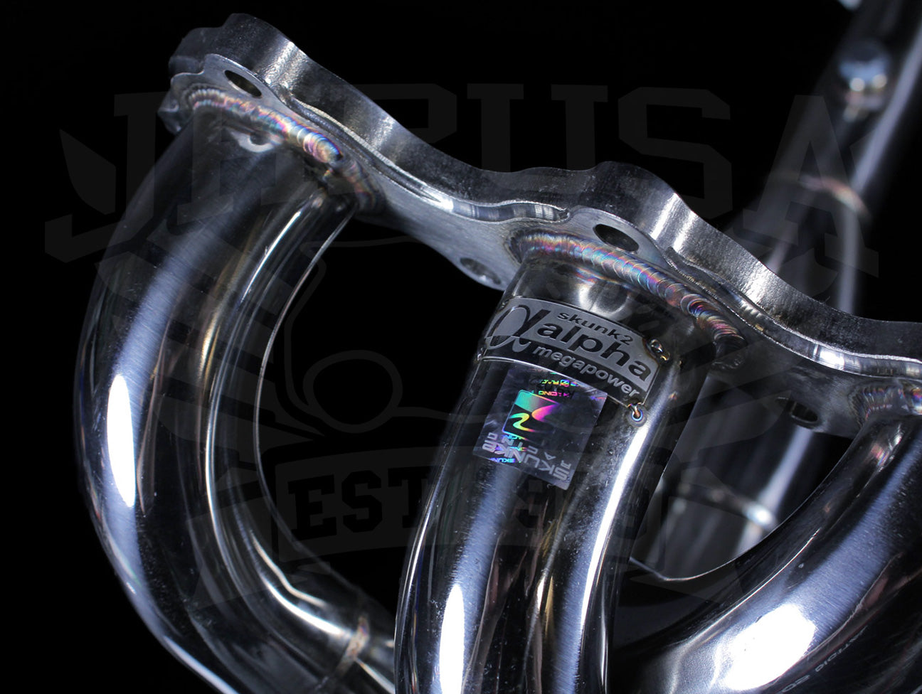 Each Skunk2 Alpha Series Header features equal-length, sequentially paired, stepped primaries and a 4-2-1 tri-Y design that terminates into a collector with a 2.5-inch outlet. These features, paired with Skunk2’s unique design specs, provide an extremely broad powerband that’s applicable to a wide range of engine sizes and configurations.Skunk2 is proud to announce its all-new Alpha Series Header for the Honda B-Series engines. Patented after our already popular and dyno-proven MegaPower Headers, which have been used by leading, competitive race teams for years, Skunk2’s Alpha Series Header employs many of the same design characteristics and technology. Our decision to produce the Alpha Series Header was driven by our desire to make our race-proven design more affordable and accessible to everyday enthusiasts. New manufacturing techniques allow us to do so at a lower overall cost, making race-winning header technology available to everyone. Skunk2’s Alpha Series Header for VTEC and non-VTEC B-series engines offers Skunk2 performance, industry-leading customer service, and a full warranty policy, all at a price comparable to lesser budget-minded headers. Unlike the budget-minded headers, though, only Skunk2 Alpha Series Headers ensure precise fitment and the peace of mind of knowing that a Skunk2 representative is just a phone call or email away.