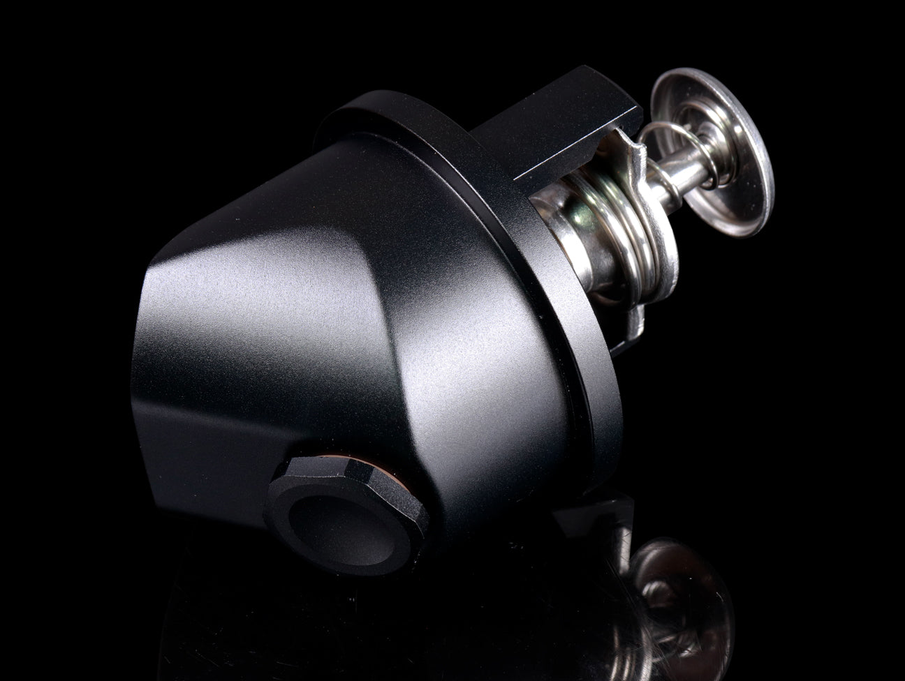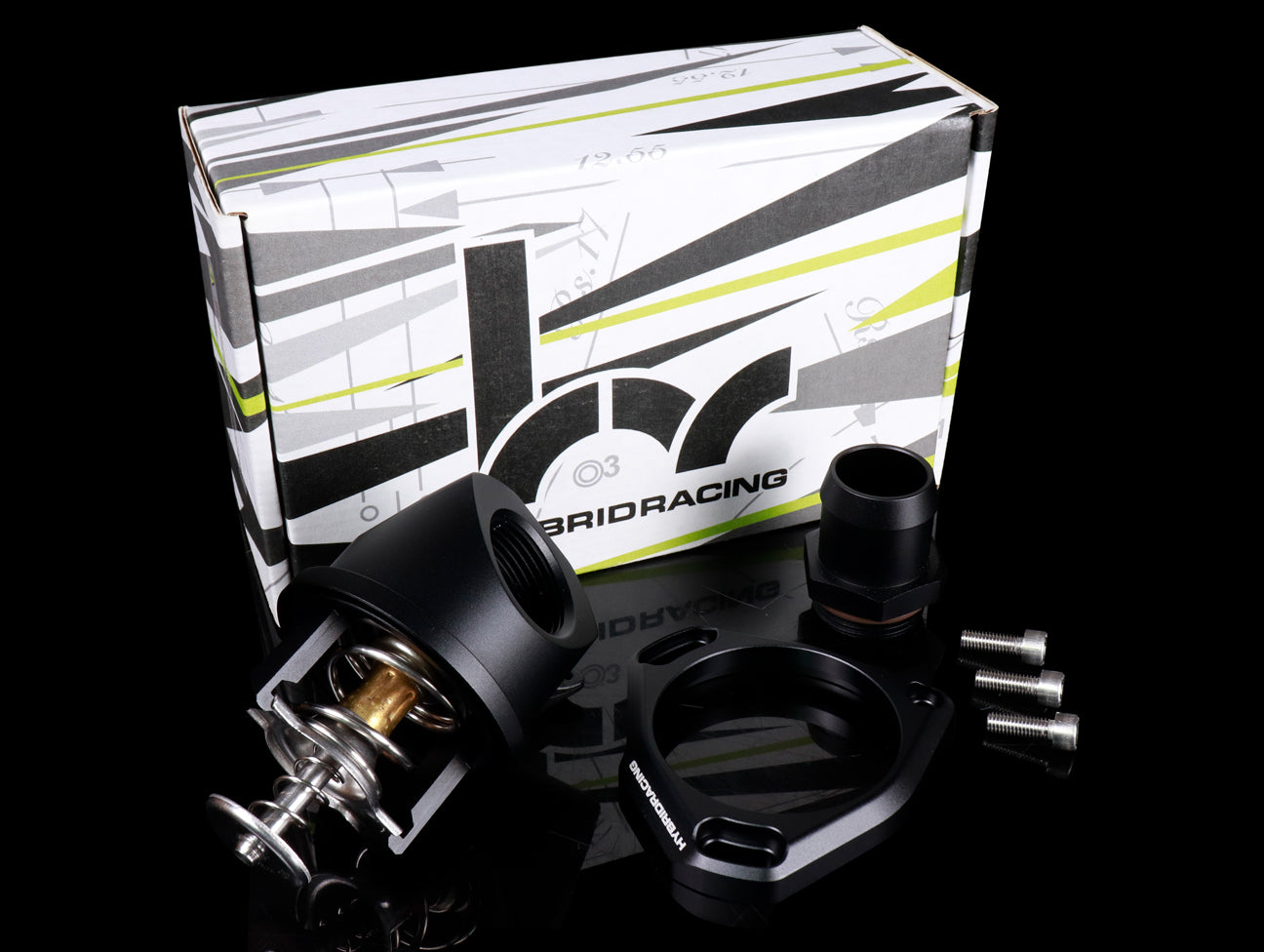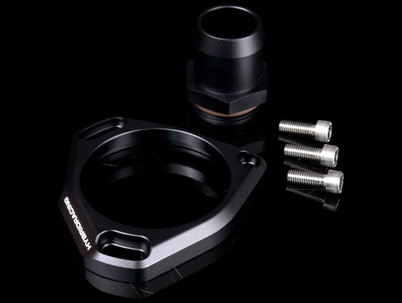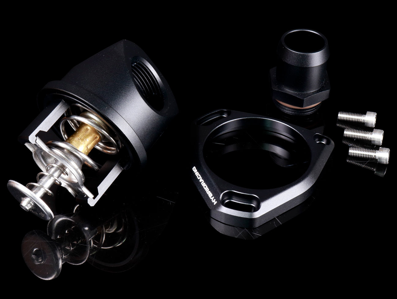 Hybrid Racing's thermostat housing was designed for customers looking for OEM quality parts that function beyond the constraints of factory parameters. The sculpted housing is machined from billet aluminum and then treated to a high-quality black anodized finish. This thermostat housing is adjustable, allowing it to fit many engine and radiator combinations.