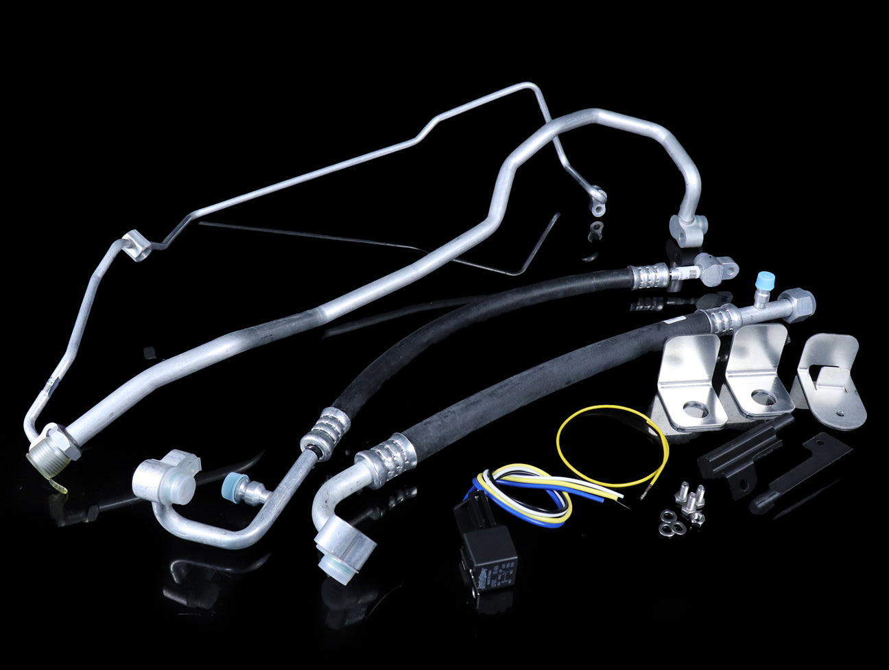 The AC kit comes with 4 custom AC lines, 3 mounting brackets used to mount the AC condenser and all necessary wiring and O-rings.