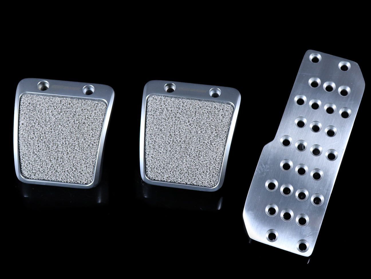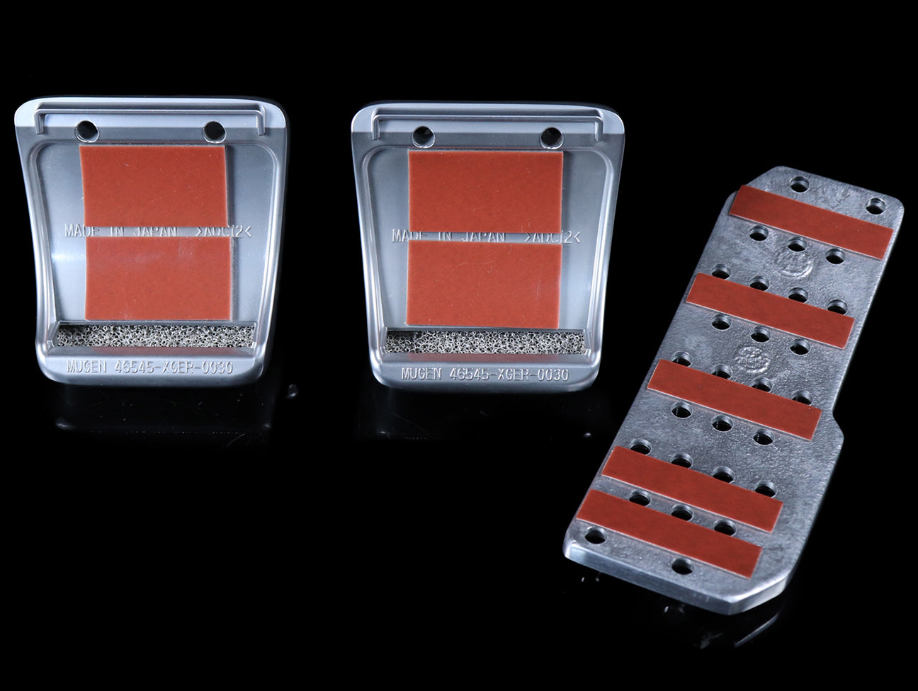 For sports driving nimble footwork is needed. With the Mugen Sports Pedal Kit the accelerator is made to allow some grip give, while theclutch and brake pedals are made with a nickel-chrome blown metal non-slip surface. This allows a sure grip on the brake while performing heal/toe footwork.