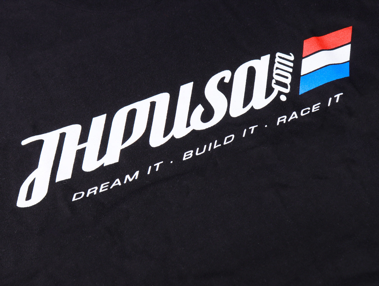 JHPUSA Tee features JHPUSA Motorsports logo and Dream It. Build It. Race It. across the front chest.