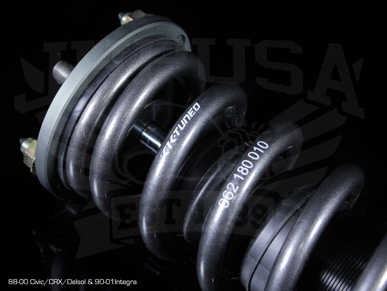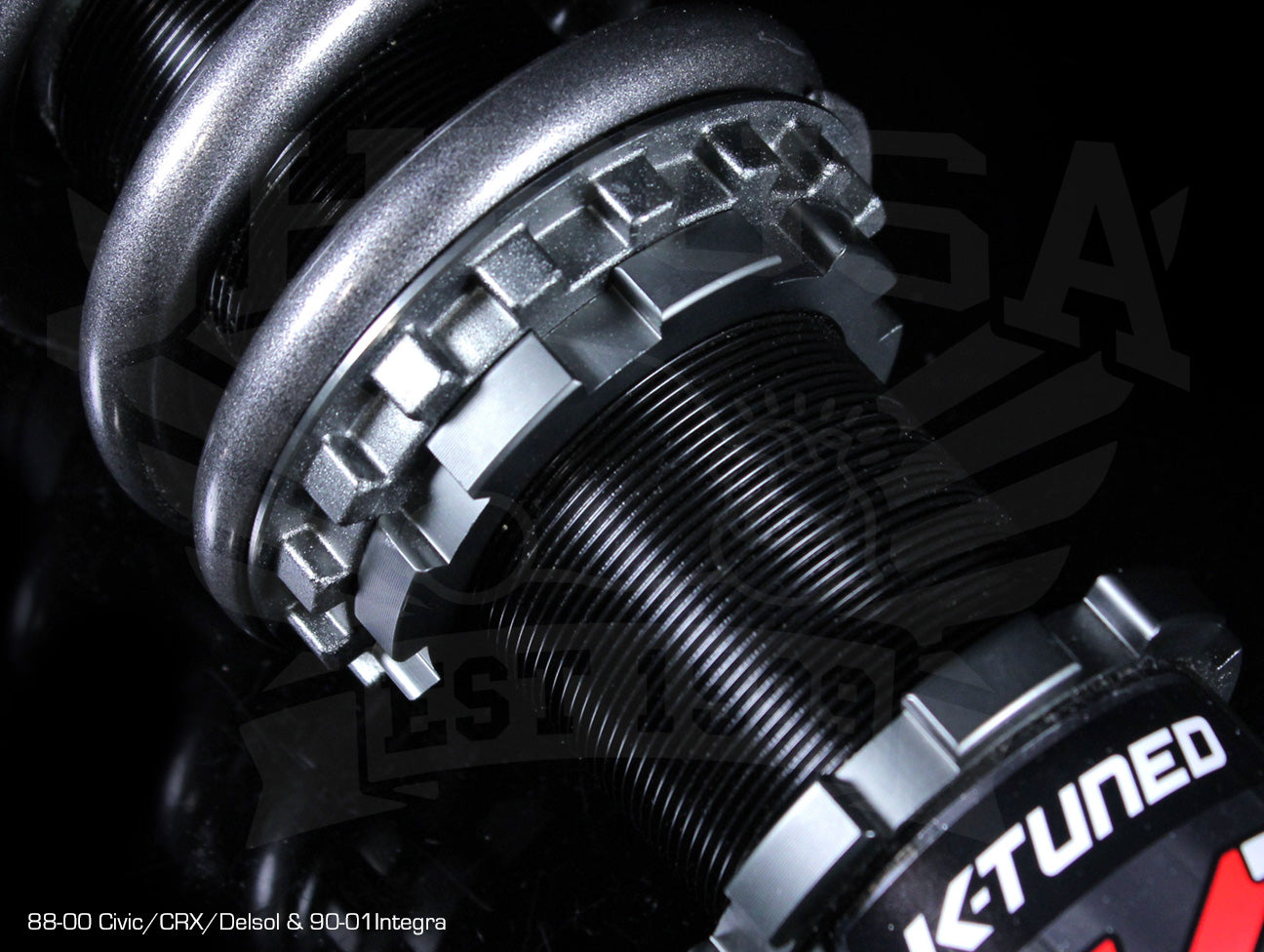 Next, K-Tuned pairs the struts with a high-tensile strength steel spring that is designed to last without sagging or premature wear. Springs are tested to ensure there is no coil bind and full range of motion. The high quality strut and dampening allows us to use the proper spring rates needed for each setup that will complement the adjustable dampening rates. Each spring is mounted on adjustable aluminum perches that can be used to adjust preload and travel. Dual bearing and incorporated washer are in place to keep the system free moving especially on McPherson style struts.