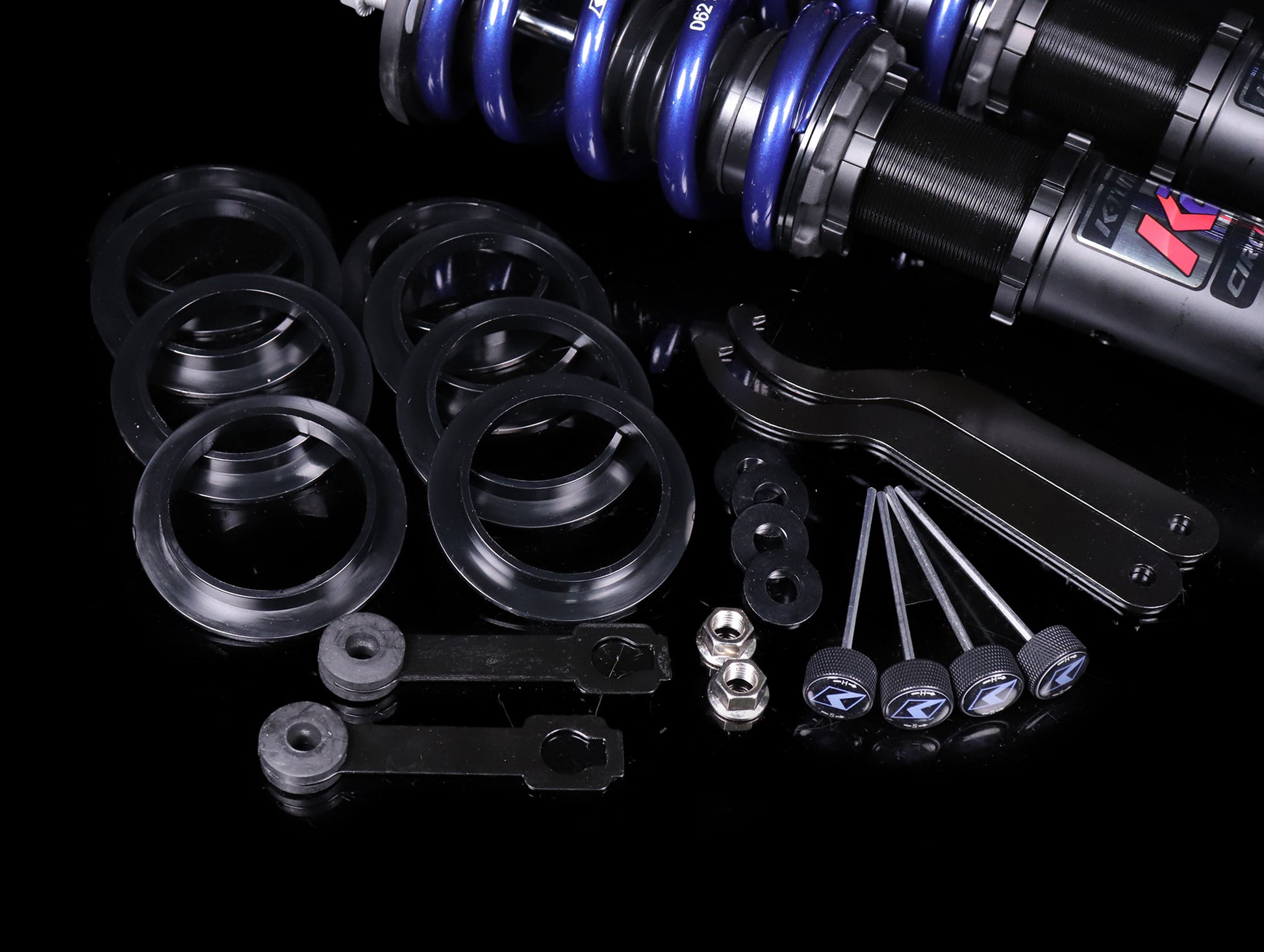 Next K-Tuned pairs the struts with a high-tensile strength Swift Spring that is designed to last without sagging or premature wear. Swift Springs have proven themselves to last longest into a race without fatiguing. Springs are tested to ensure there is no coil bind and full range of motion. The high quality strut and dampening allows K-Tuned to use the proper spring rates needed for each setup that will complement the adjustable dampening rates. Each spring is mounted on adjustable aluminum perches that can be used to adjust preload and travel. Incorporated washer and spacers are in place to keep the system free moving especially on McPherson style struts.