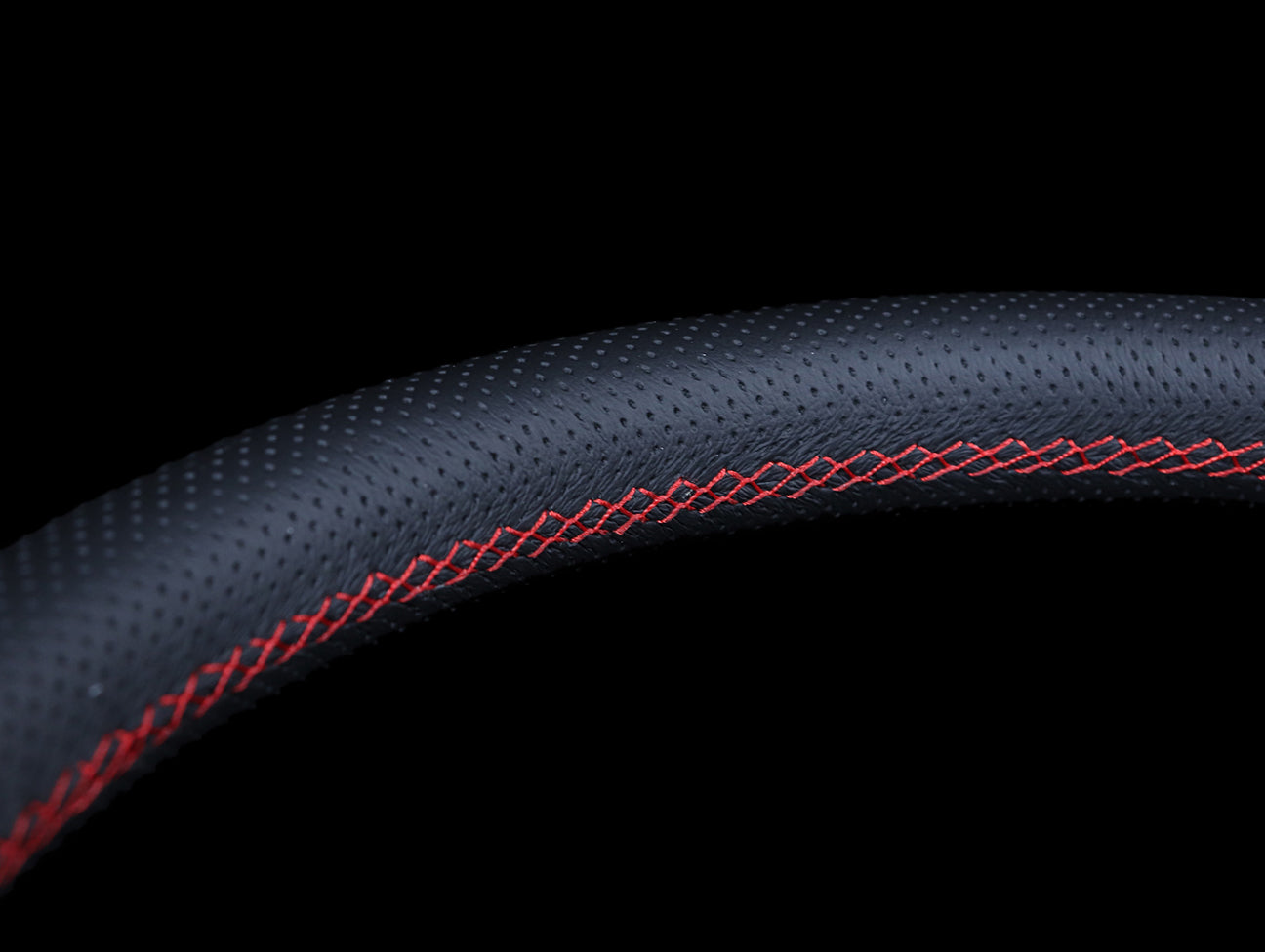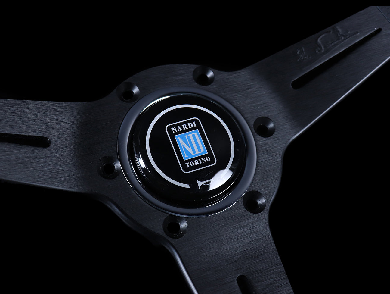 This Nardi Classic steering wheel has black perforated leather hand grips, red stitching, anodized black spokes, and genuine Nardi horn button.