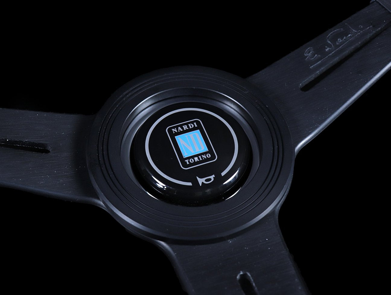 This Nardi Classic steering wheel has a black leather hand grip, grey parallel striped stitching, anodized black spokes, matching black center ring, hardware, and classic Nardi horn button.