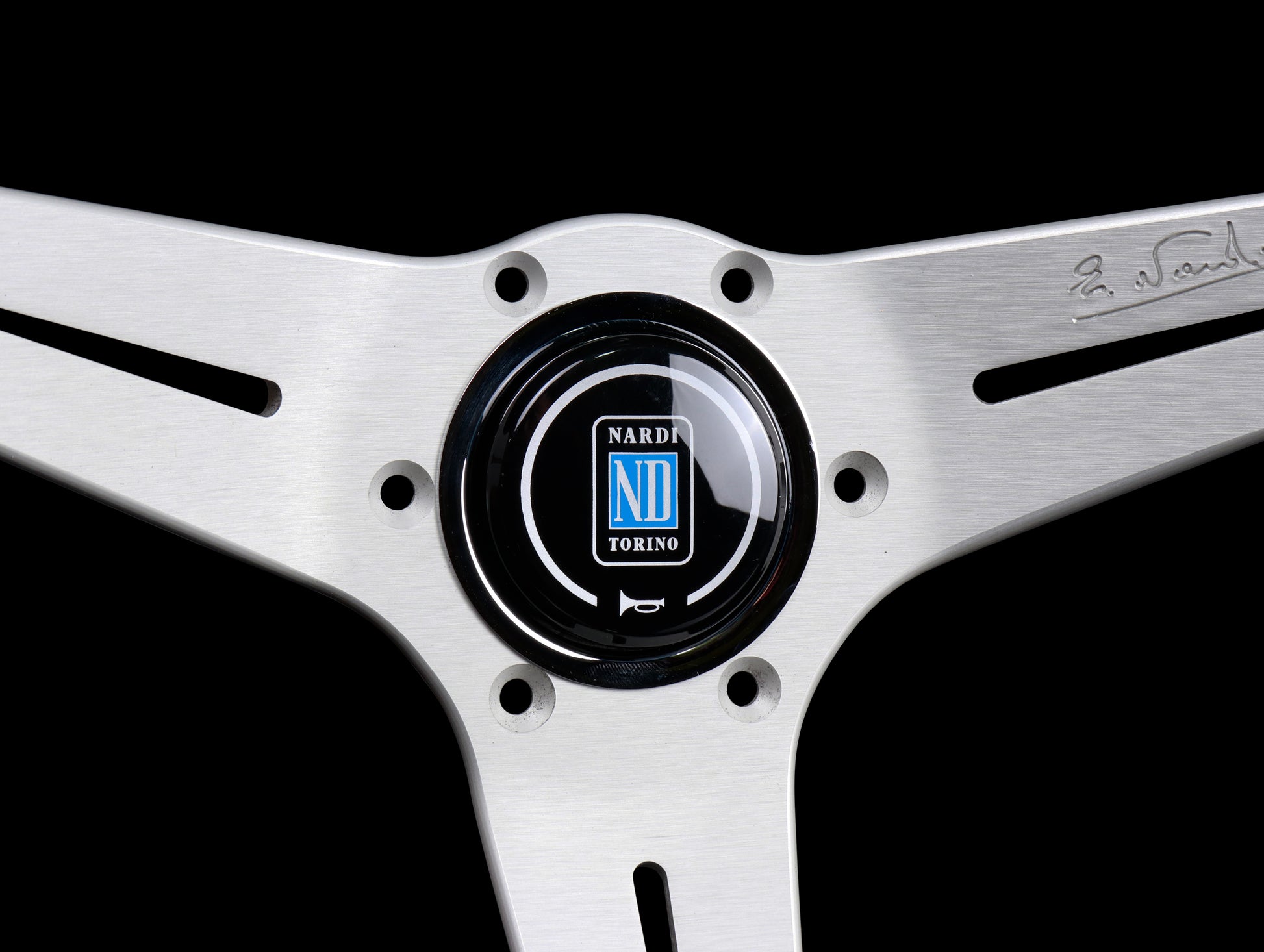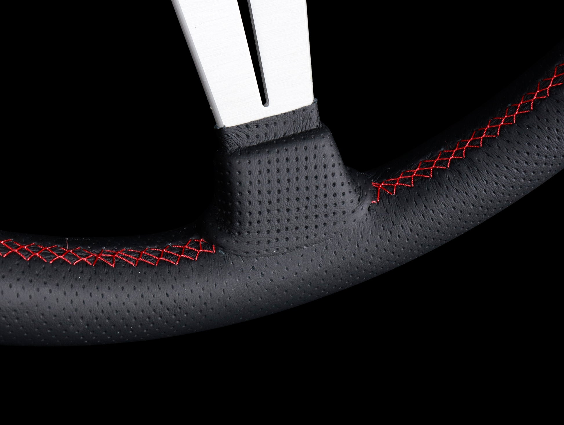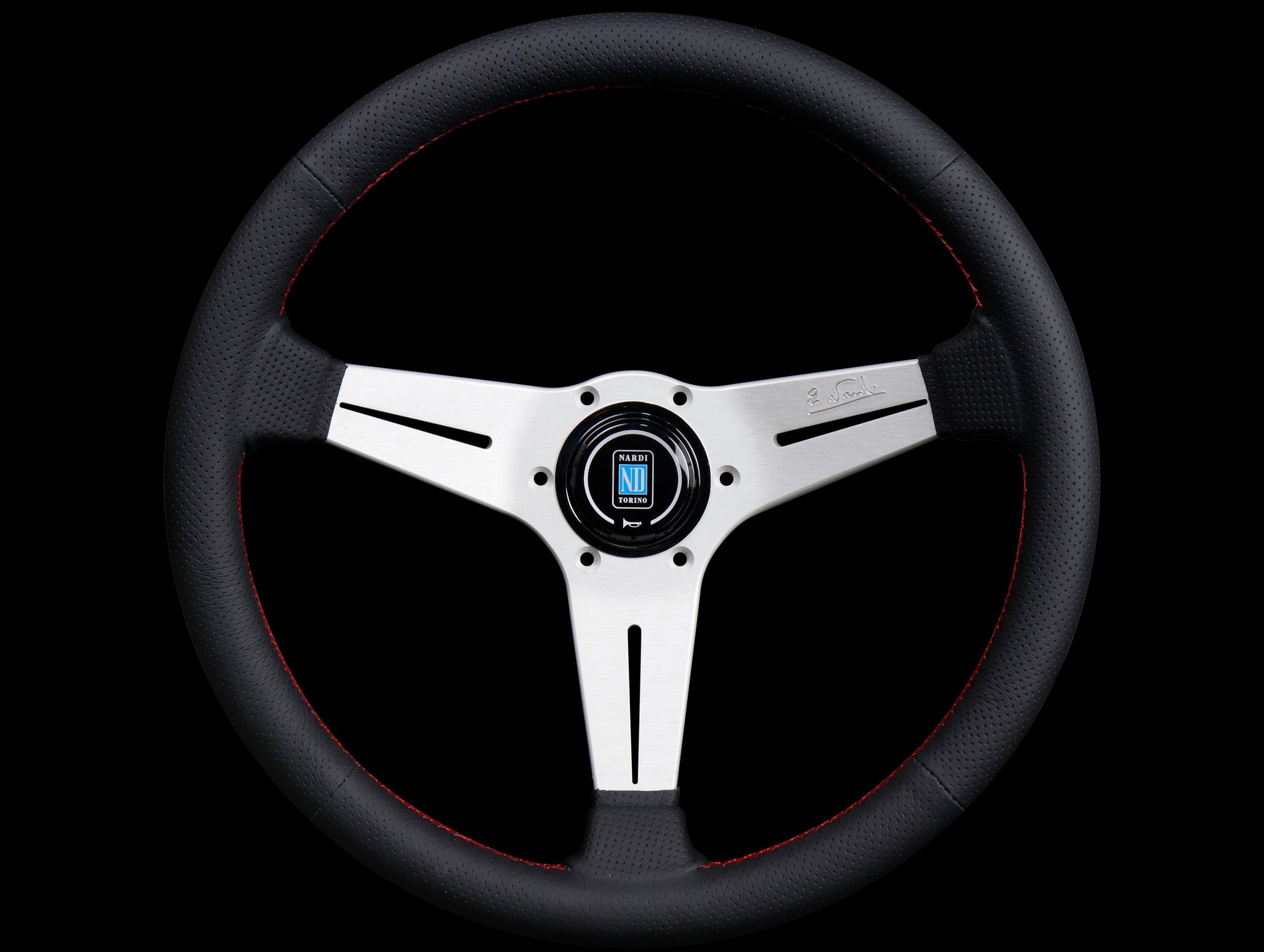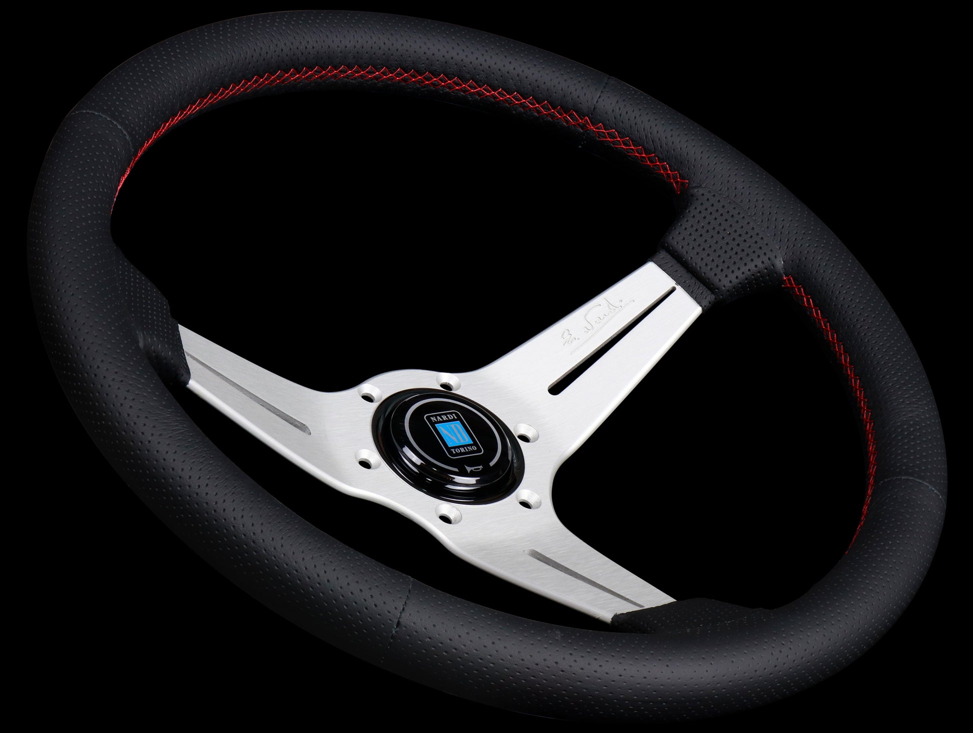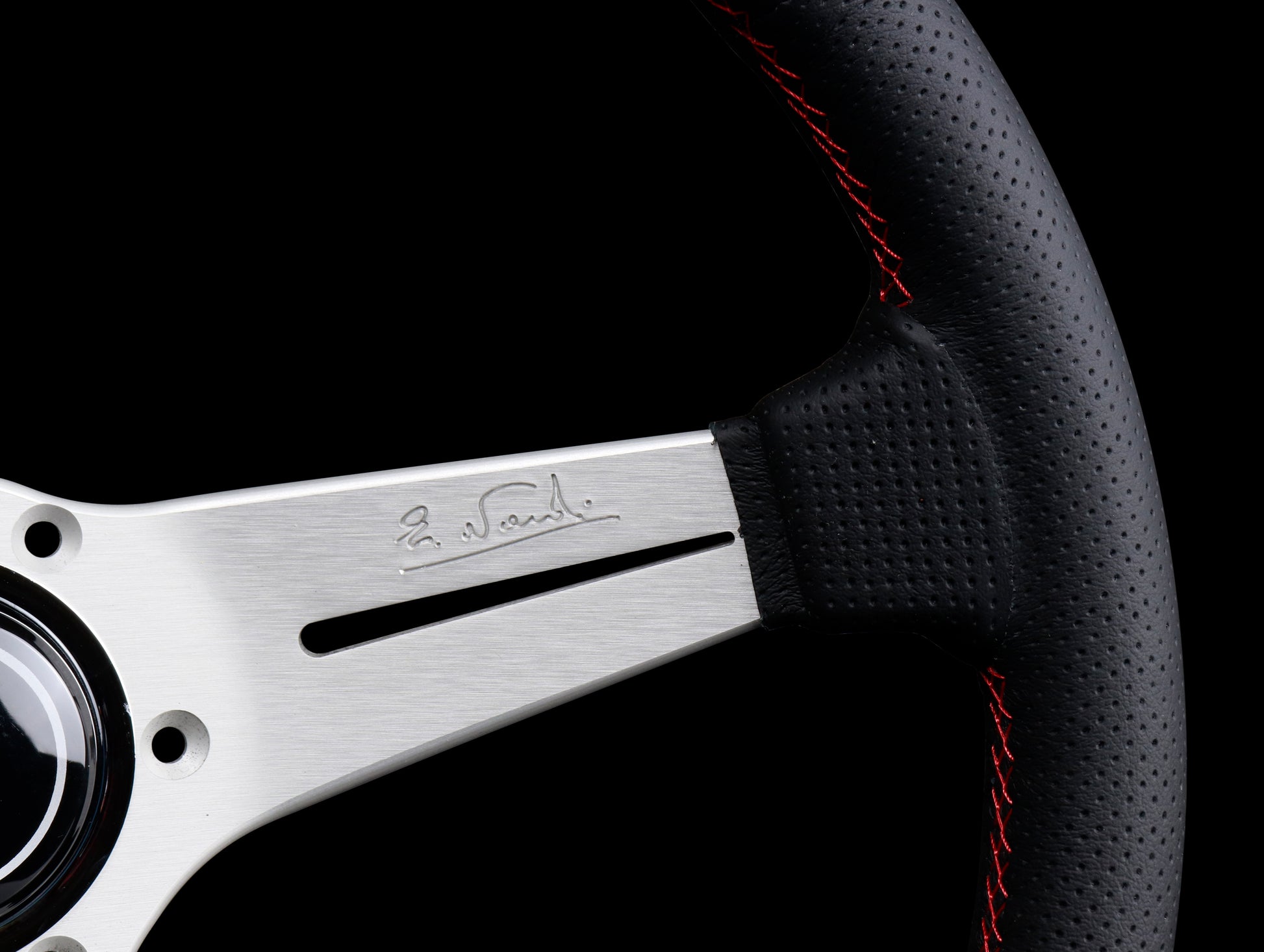 The Nardi Deep Corn Sport Rally Silver spoke is now available with black perforated leather grips, a deep spoke offset, red stitching, silver spokes, and genuine Nardi horn button.