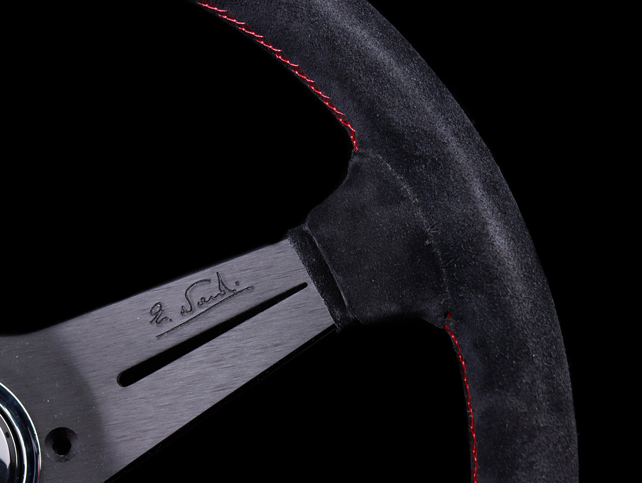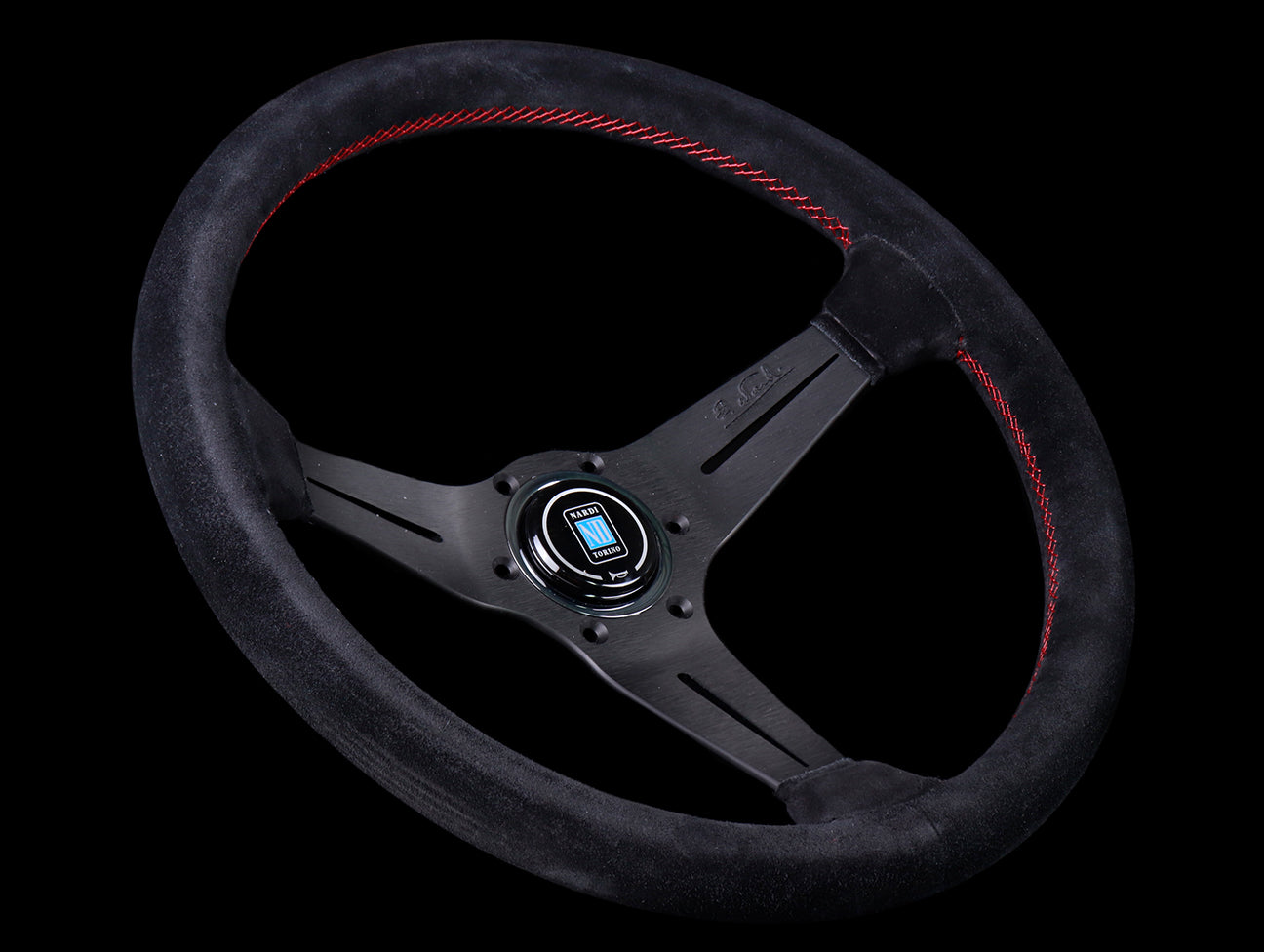 This Nardi Deep Corn Sport Rally steering wheel has a black suede hand grip, a deep spoke offset, red stitching, anodized black spokes, and Nardi horn button.