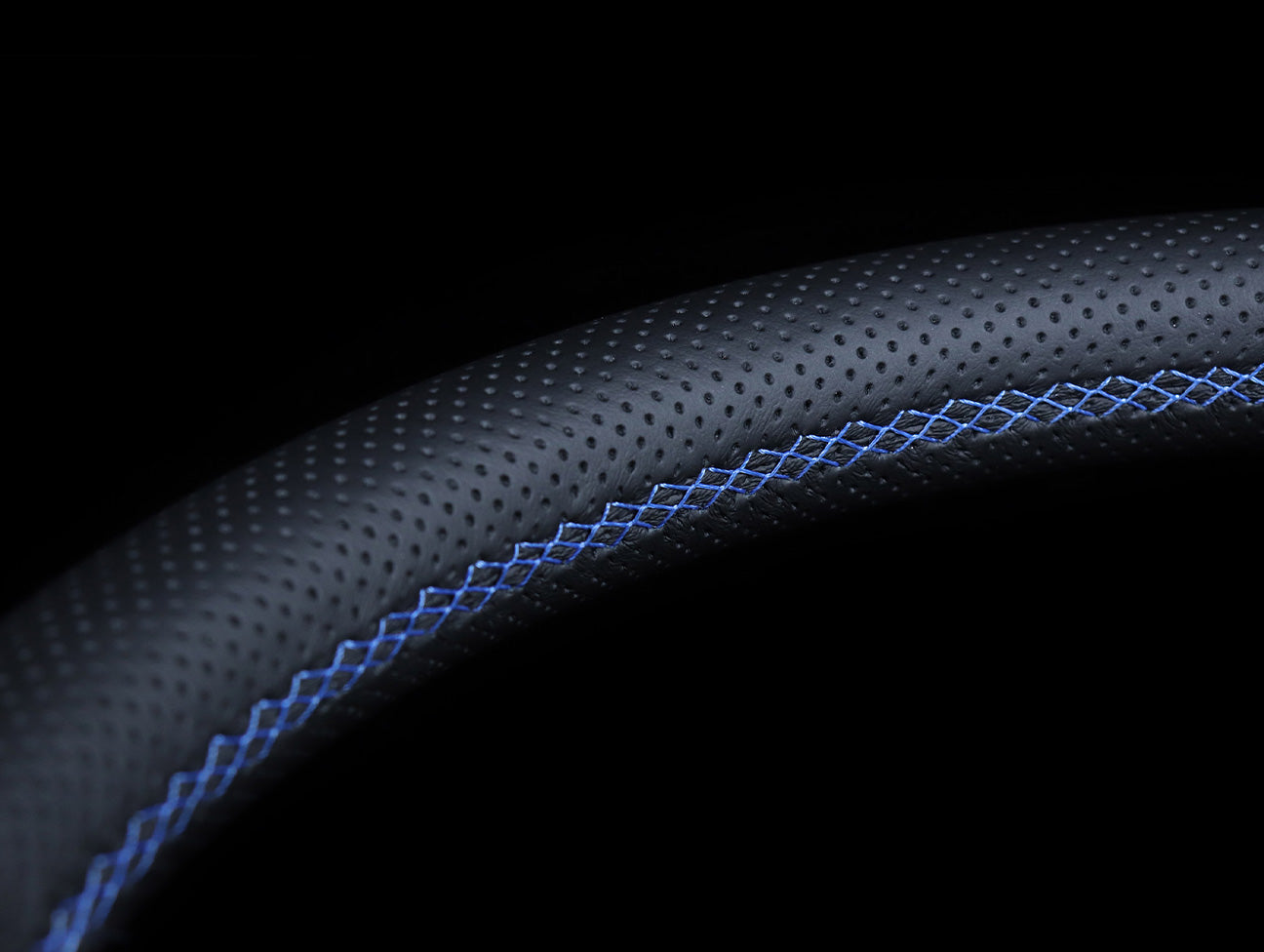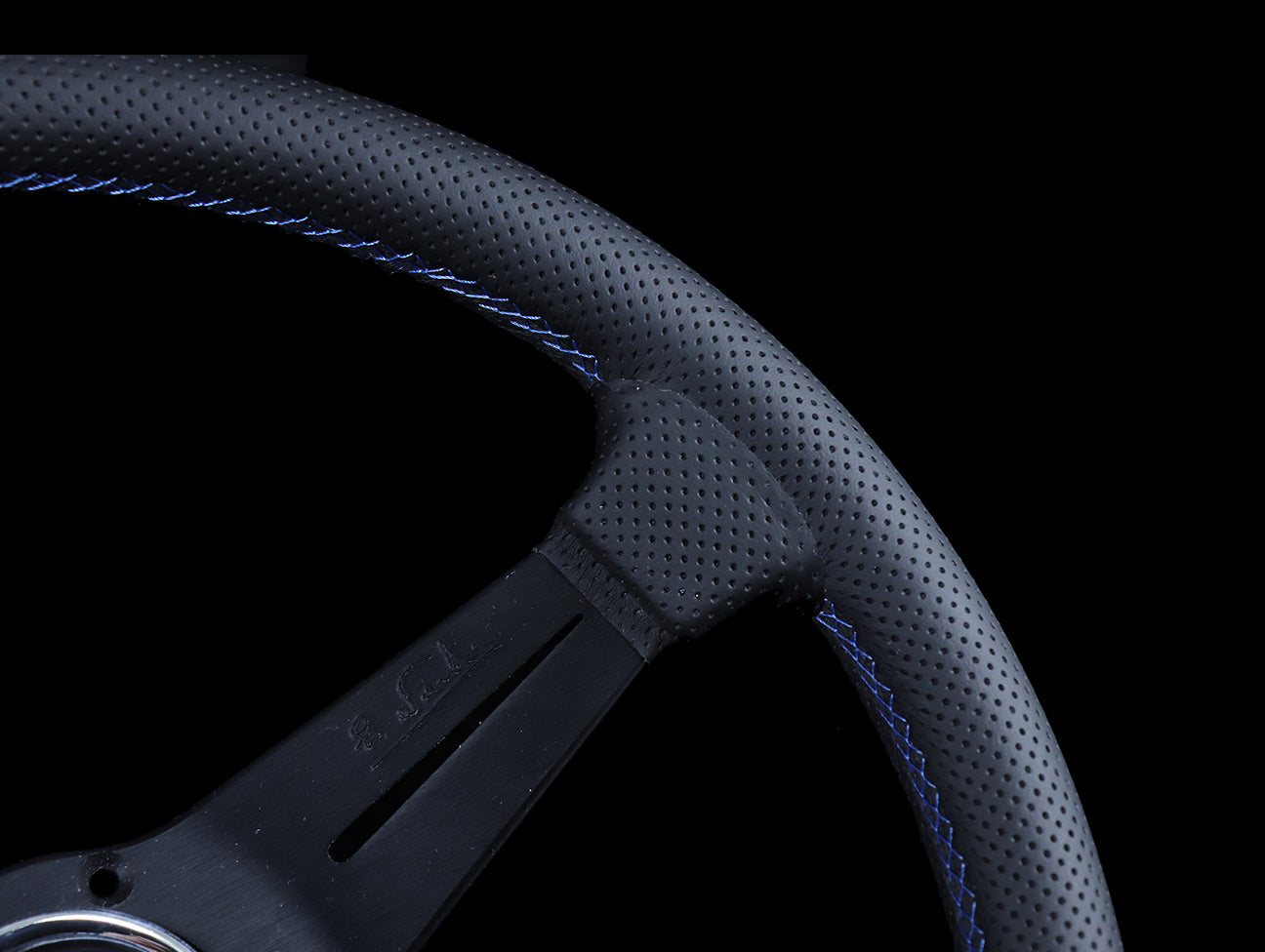 The popular Nardi deep corn sport rally steering wheel features a deep spoke offset, black perforated leather hand grips, blue cross stitching, anodized black spokes, and a genuine Nardi classic horn button.