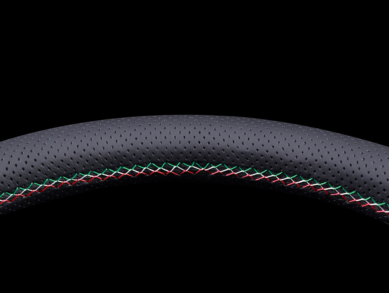 The popular Nardi deep corn sport rally steering wheel features a deep spoke offset, black perforated leather hand grips, green/white/red Italian themed cross stitching, anodized black spokes, and a genuine Nardi classic horn button.
