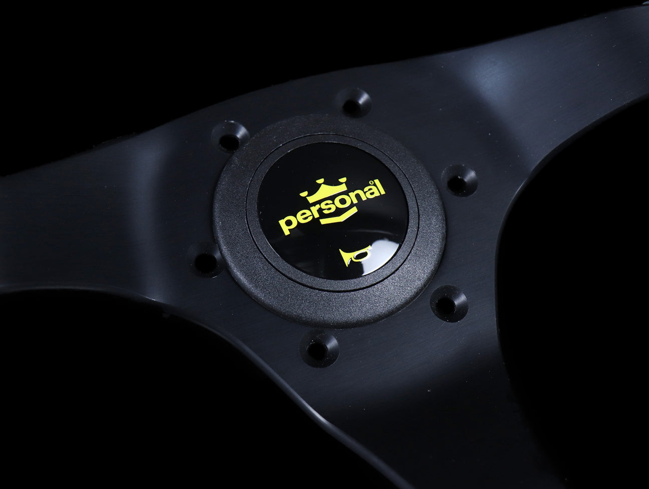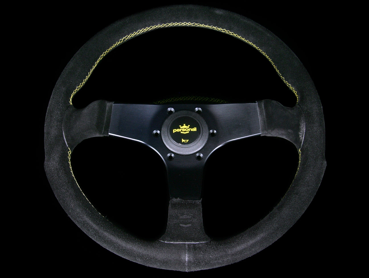 The Personal Fitti Corsa steering wheel has a black suede hand grip, yellow stitching, anodized black spokes, and yellow Personal logo horn button.
