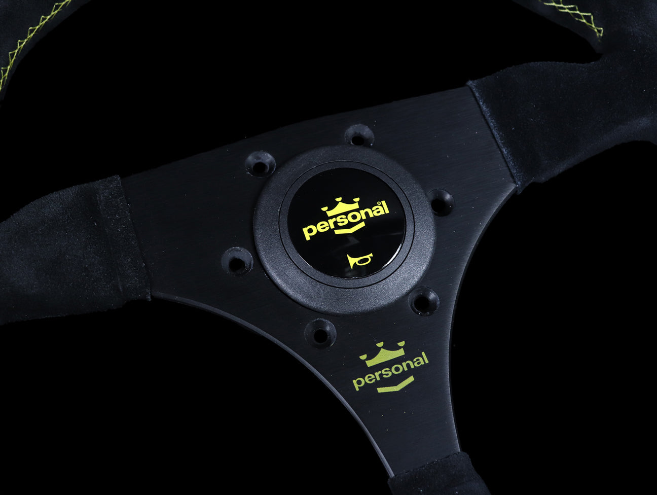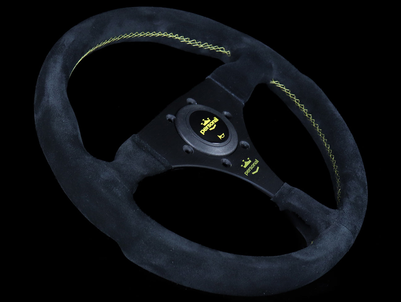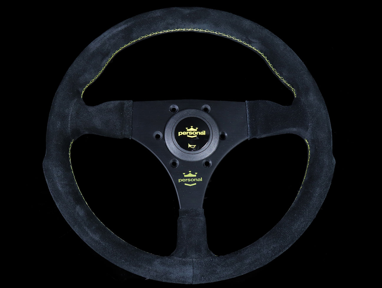 The Personal Fitti F1 steering wheel has a black suede hand grip, yellow stitching, anodized black spokes, and yellow Personal logo horn button.