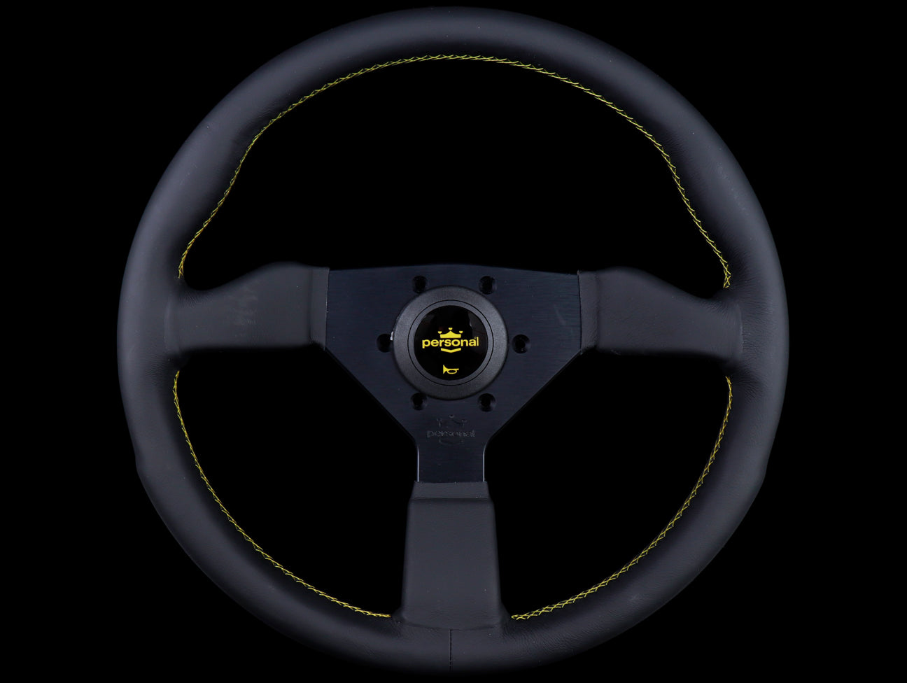 The Personal Neo Grinta steering wheel has a black leather hand grip, yellow stitching, anodized black spokes, and yellow Personal logo horn button.