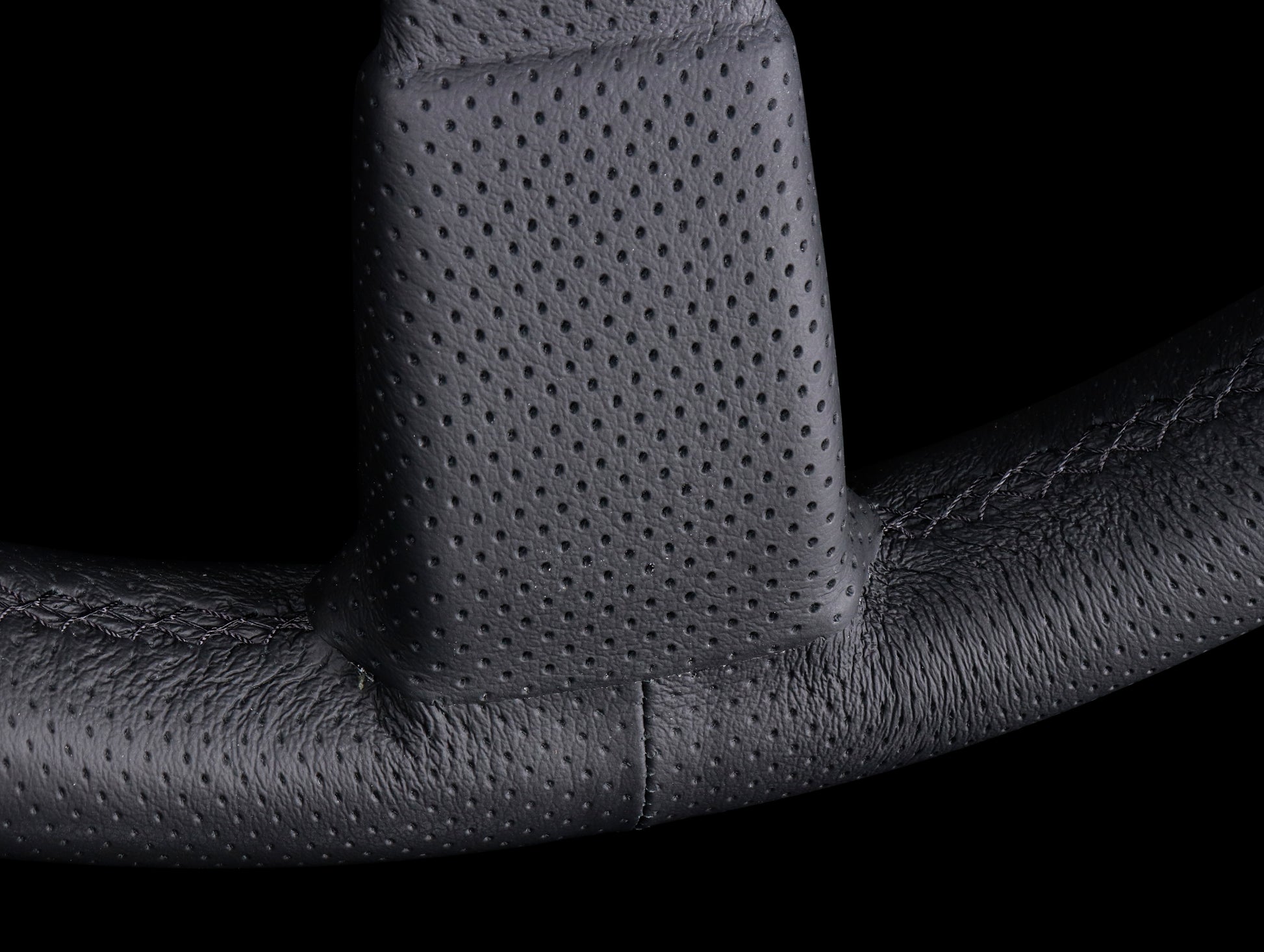 The Black Edition wheel is your classic Grinta wheel that features black perforated leather hand grips, black stitching, anodized black spokes, and a silver Personal logo horn button.