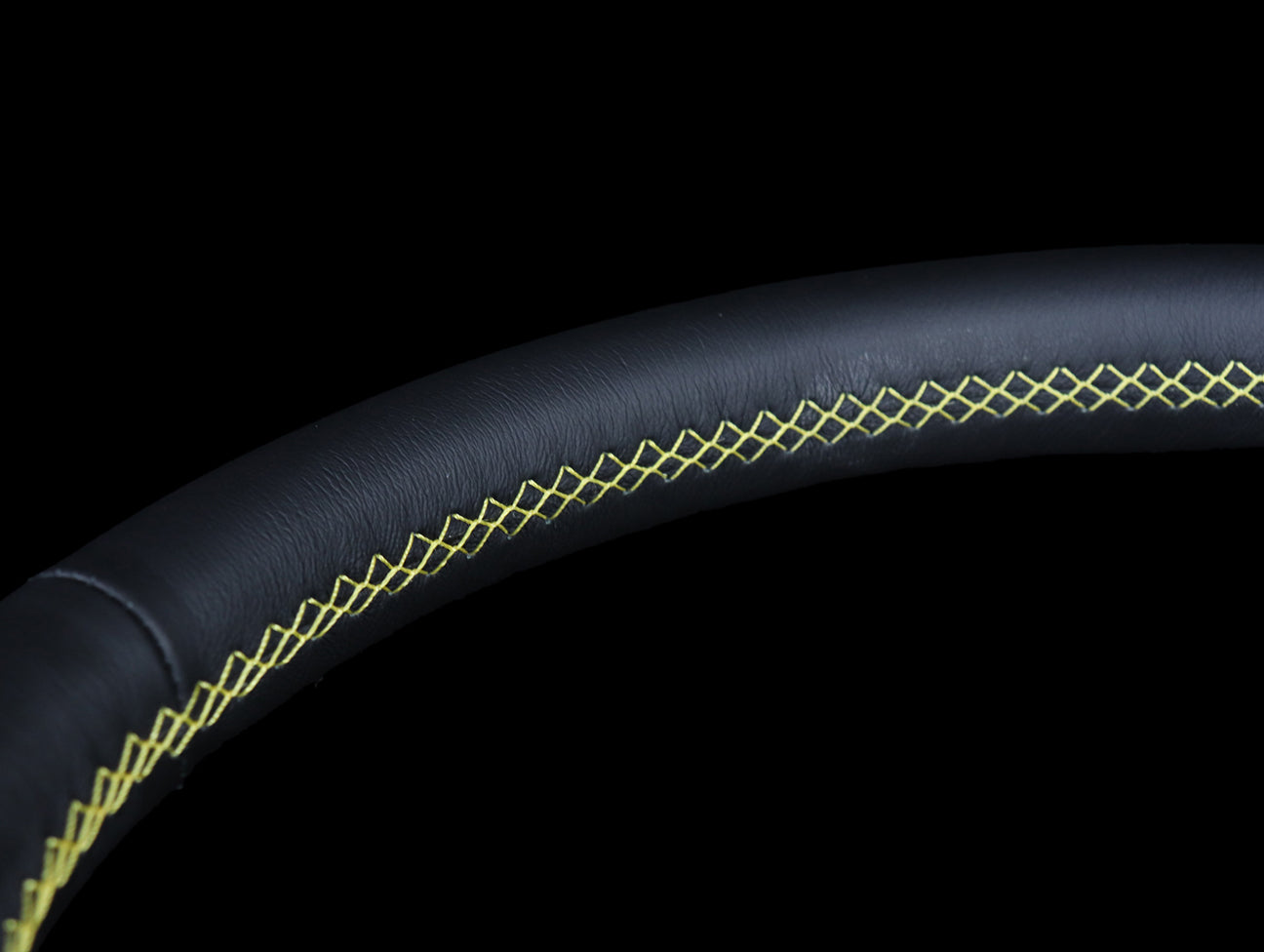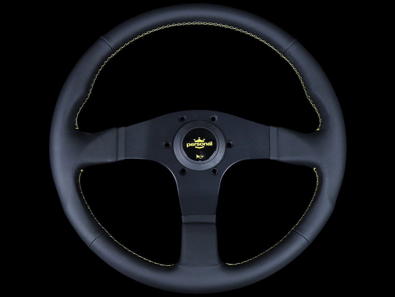The Personal Neo Actis steering wheel has a black leather hand grip, yellow stitching, anodized black spokes, and yellow Personal logo horn button.