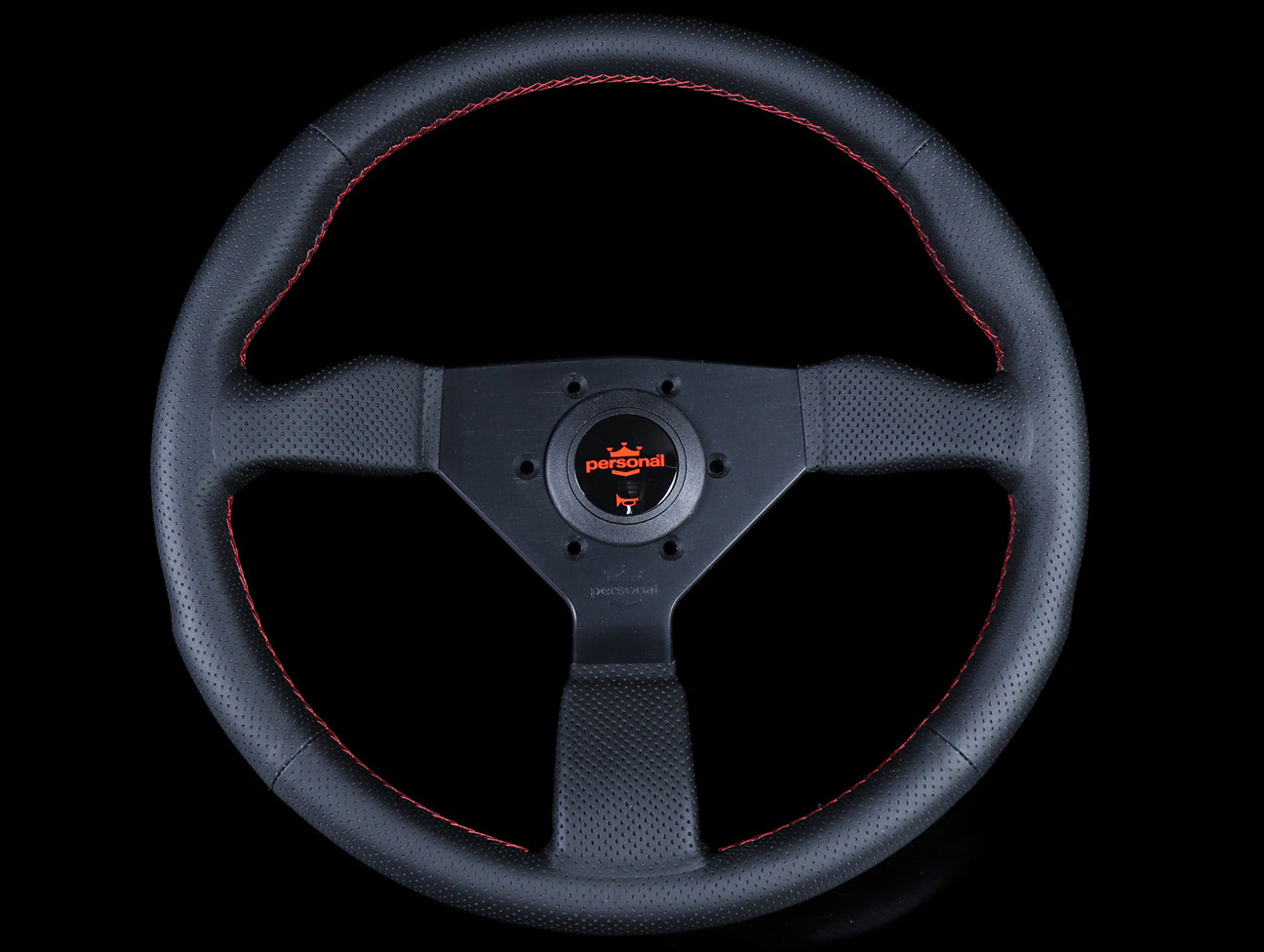 The Personal Neo Grinta steering wheel has a black perforated leather hand grips, red stitching, anodized black spokes, and red Personal logo horn button.