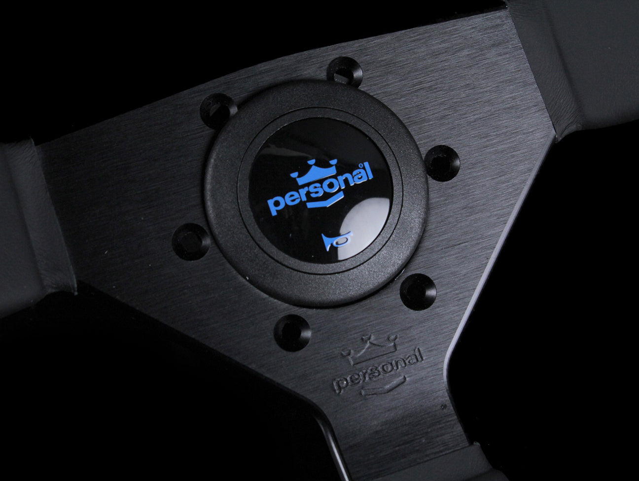 This JHPUSA Exclusive Personal Neo Grinta steering wheel comes in leather black hand grips with, anodized black spokes, BLUE crosshatched stitching accompanied by an authentic BLUE Personal logo horn button.