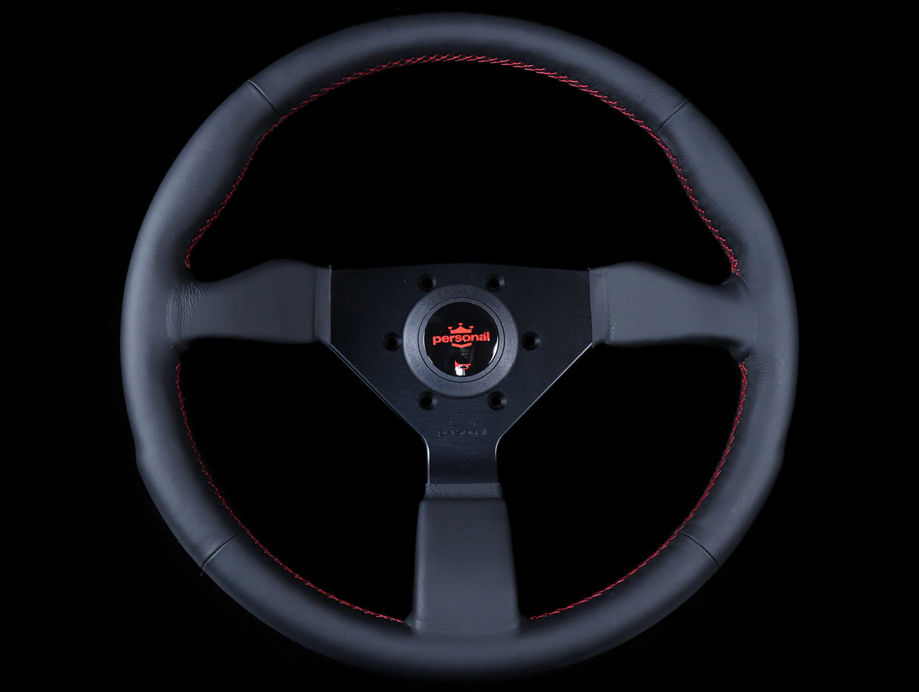 The Personal Neo Grinta steering wheel has a black leather hand grip, red stitching, anodized black spokes, and red Personal logo horn button.