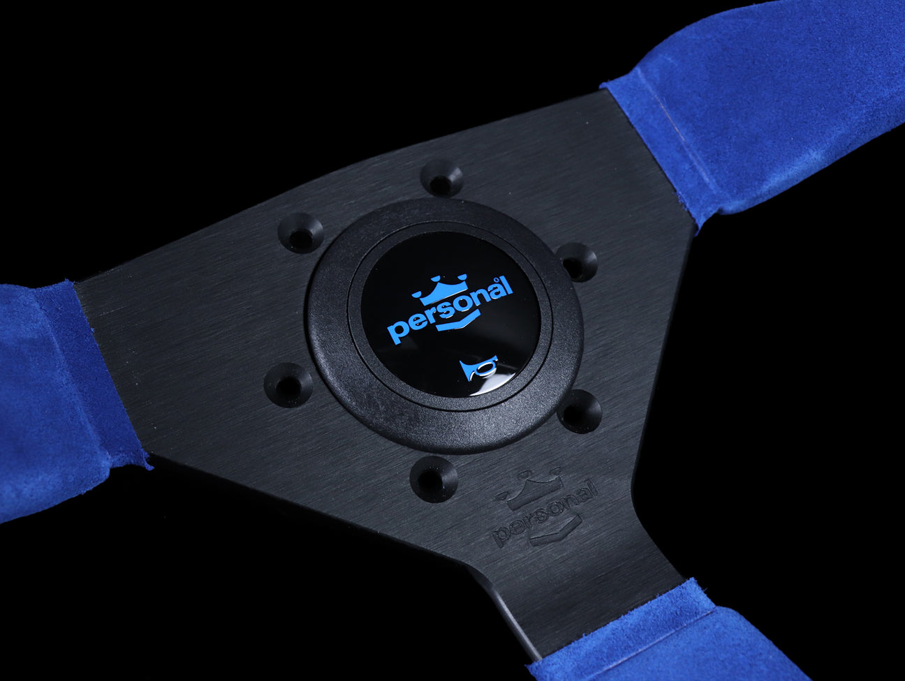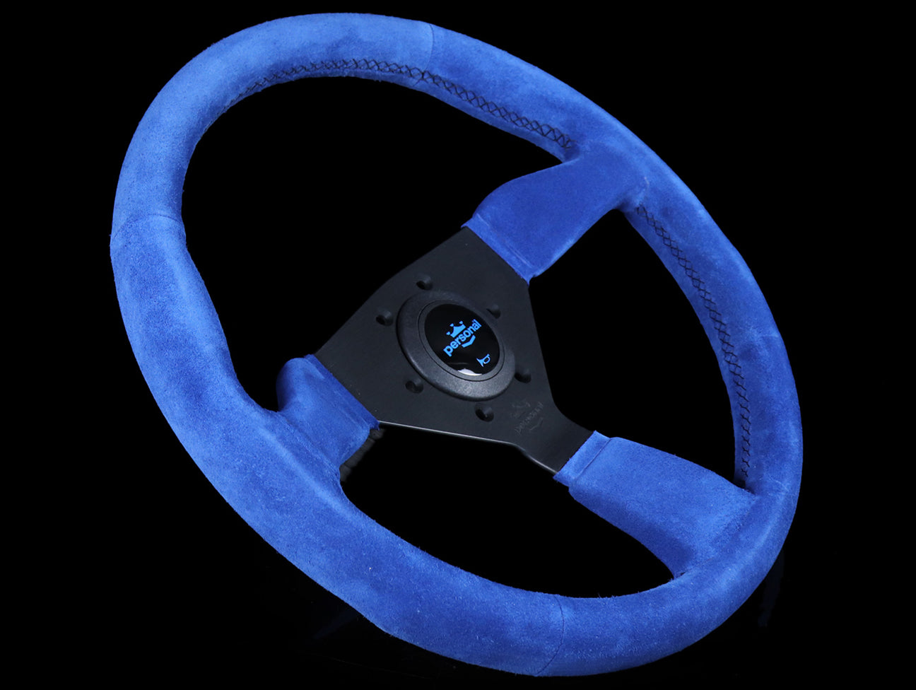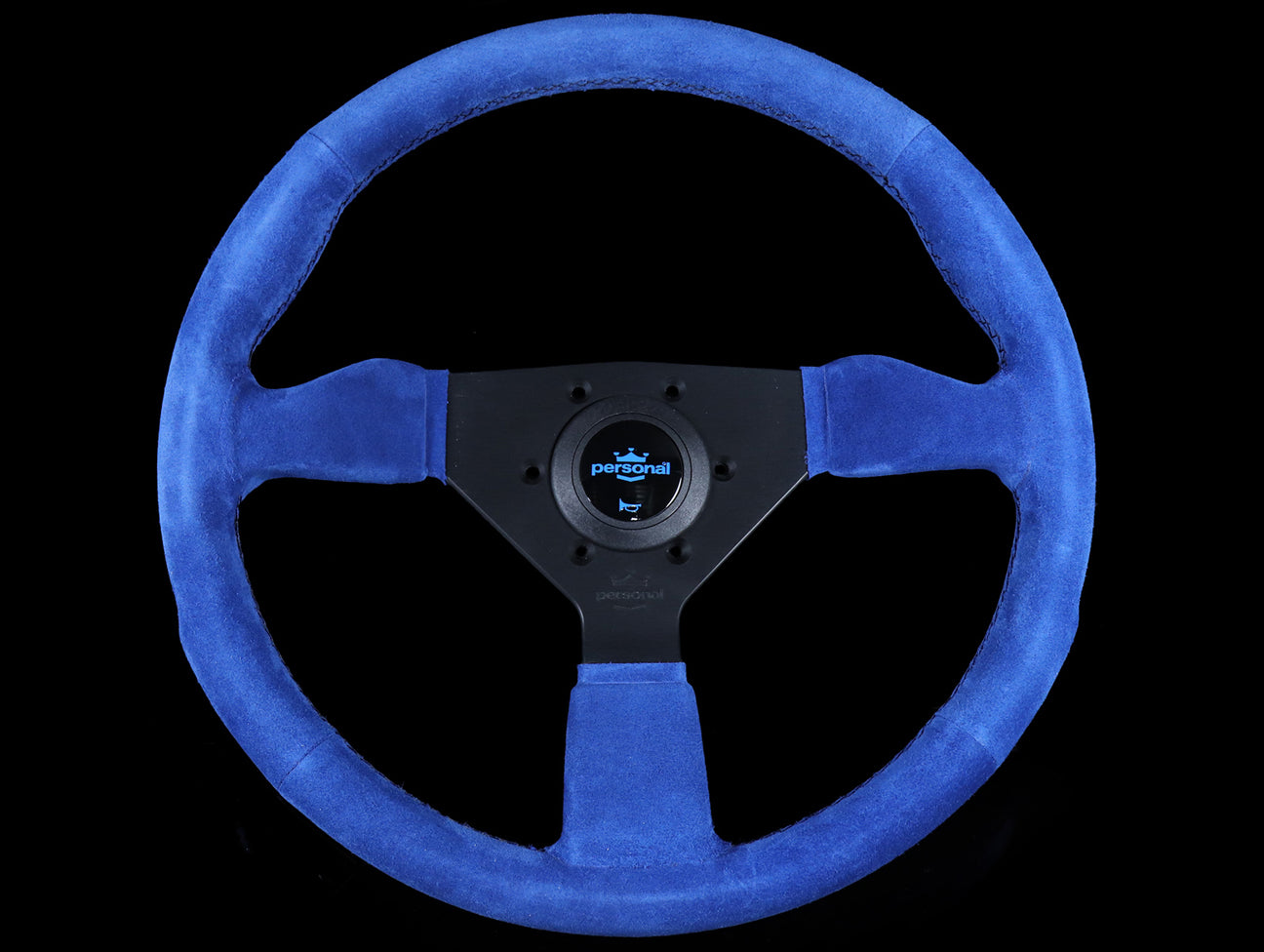 The Personal Neo Grinta steering wheel has a blue suede hand grip, black stitching, anodized black spokes, and blue Personal logo horn button.