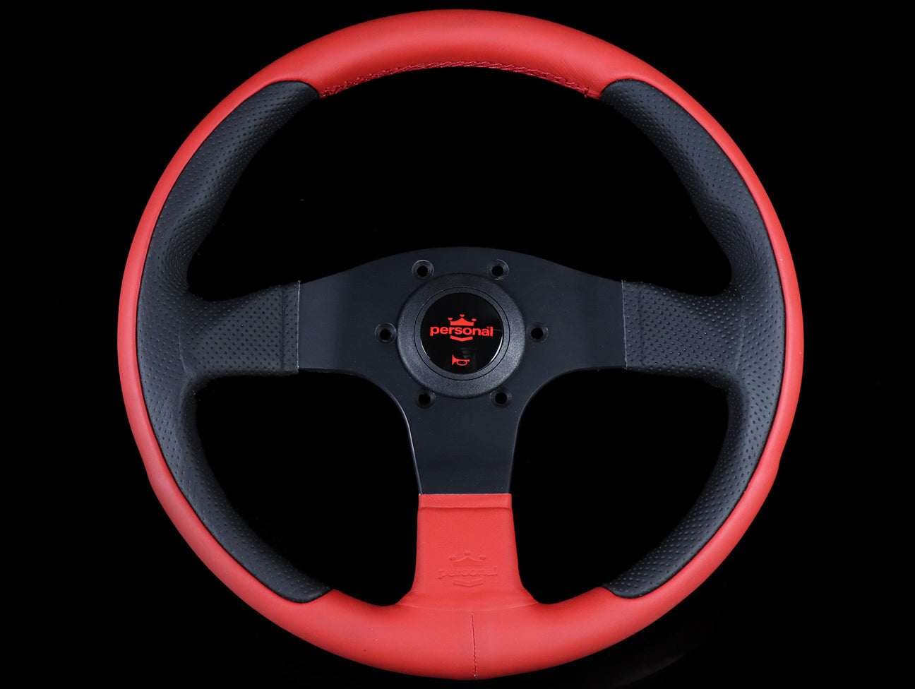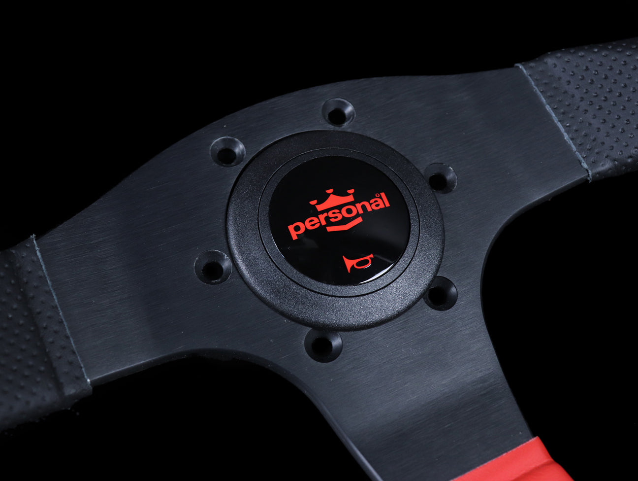 The Personal New Racing steering wheel has optional color perforated grips (perforated inner leather grip, smooth outer leather grip), anodized black spokes, and red Personal logo horn button.
