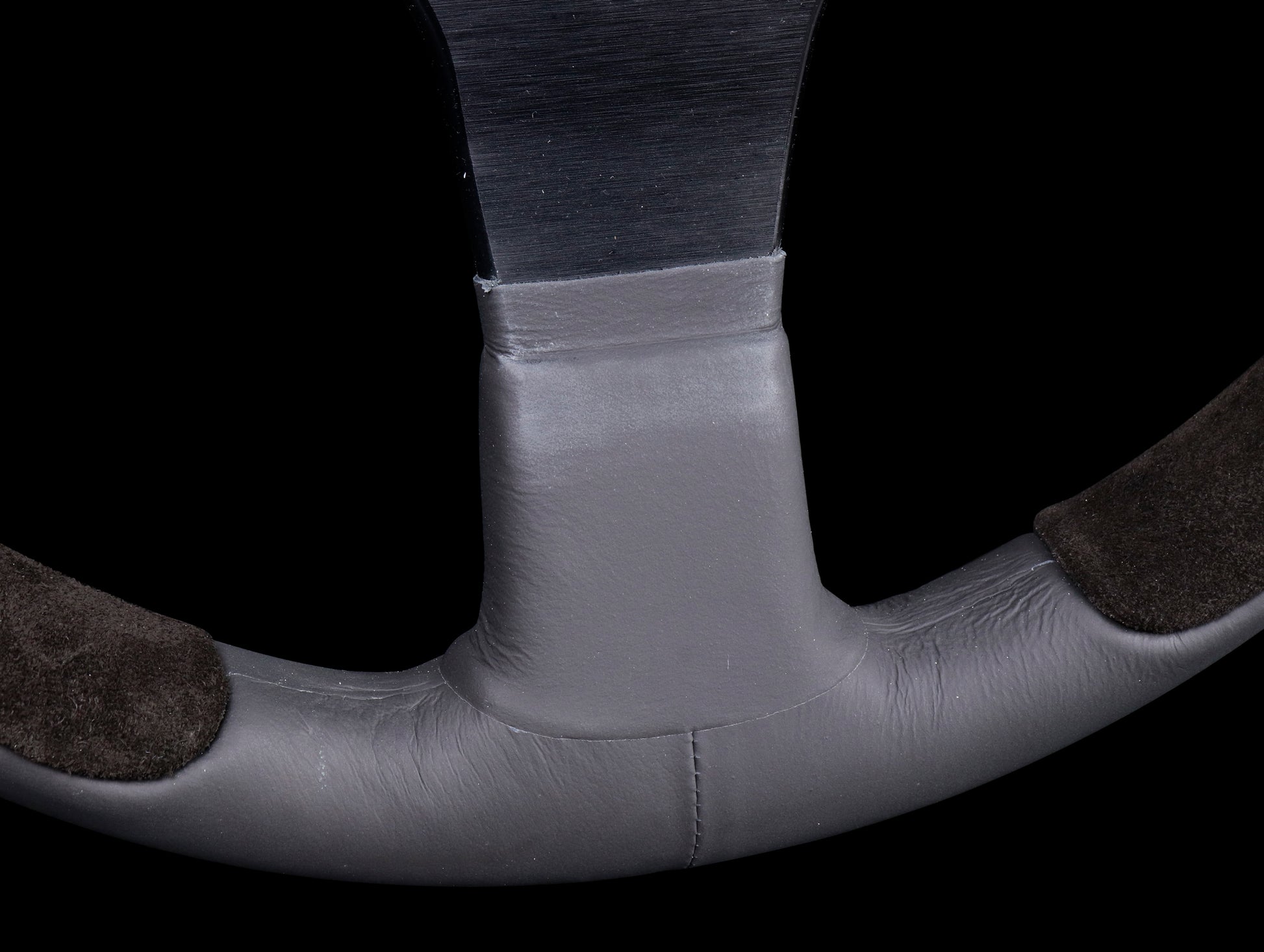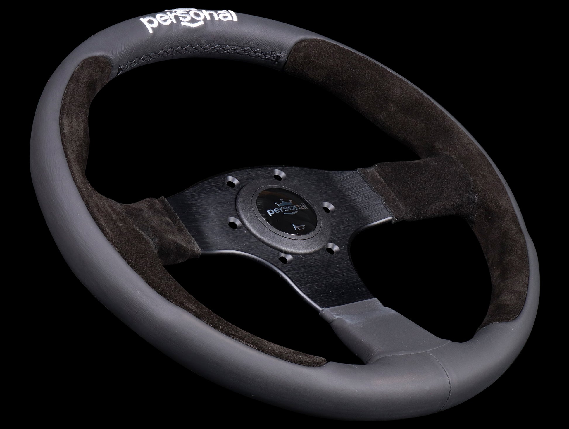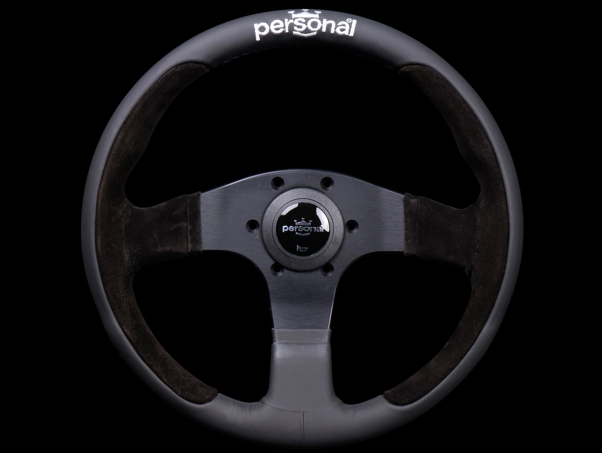 The Personal Pole Position steering wheel has a combination of black leather and black suede hand grips, anodized black spokes, a silver Personal logo horn button, and a white embroidered Personal logo at the top of the steering wheel.