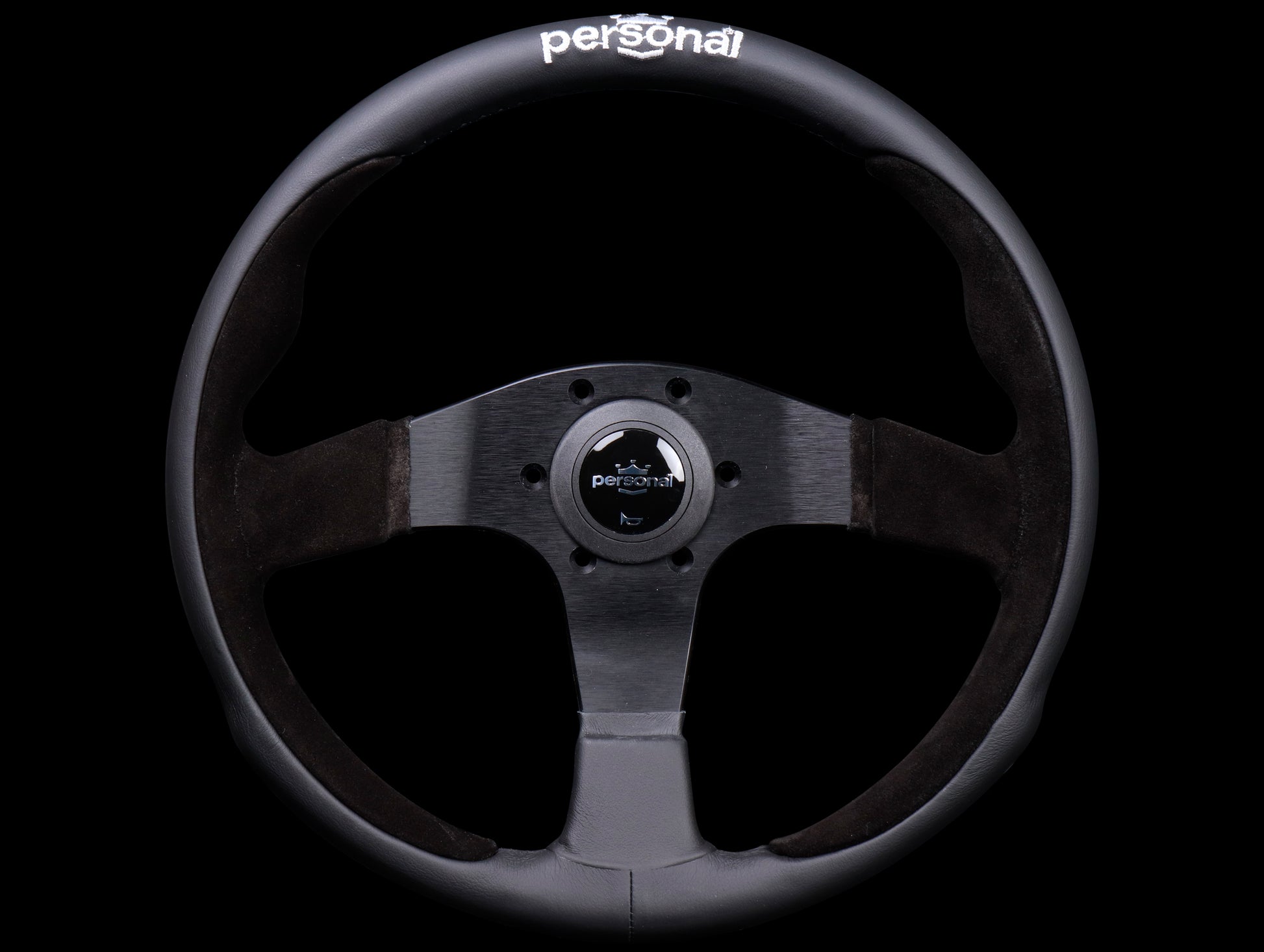 The Personal Pole Position steering wheel has a combination of black leather and suede hand grips, anodized black spokes, and silver Personal logo horn button.