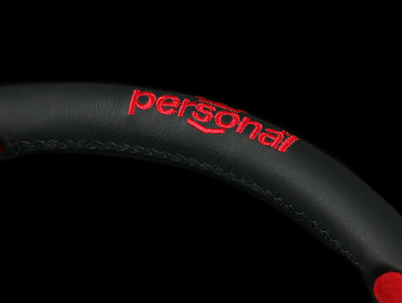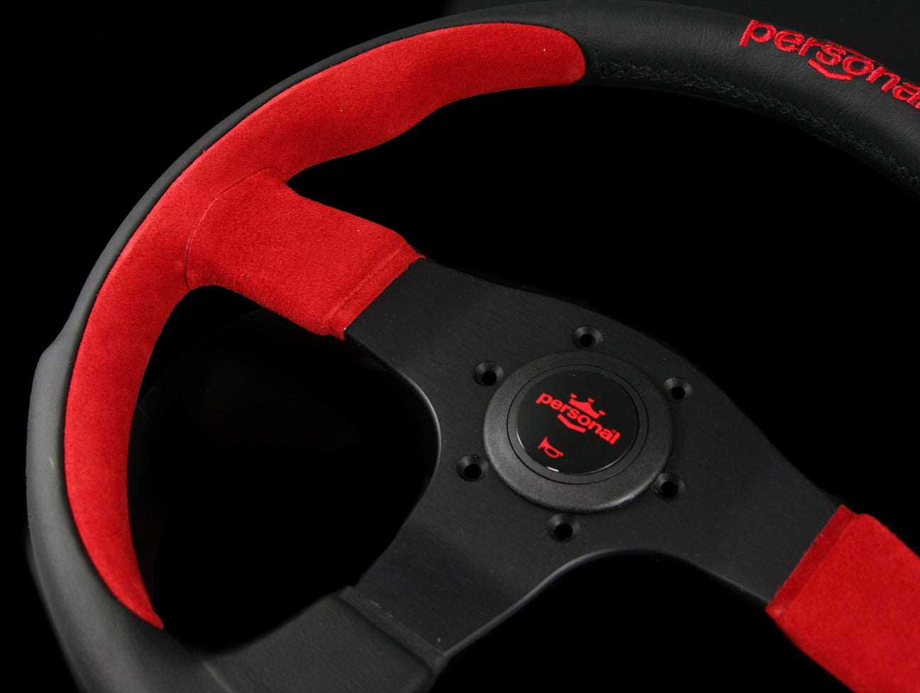 The Personal Pole Position steering wheel has a combination of black leather and red suede hand grips, embroidered Personal logo, anodized black spokes, and red Personal logo horn button.