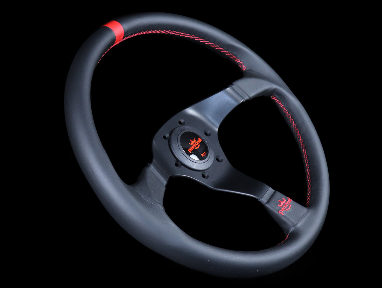 The Personal "Trophy" steering wheel has a black leather hand grip, red stitching with red rally ring, anodized black spokes, red embroidered logo, and red Personal logo horn button.